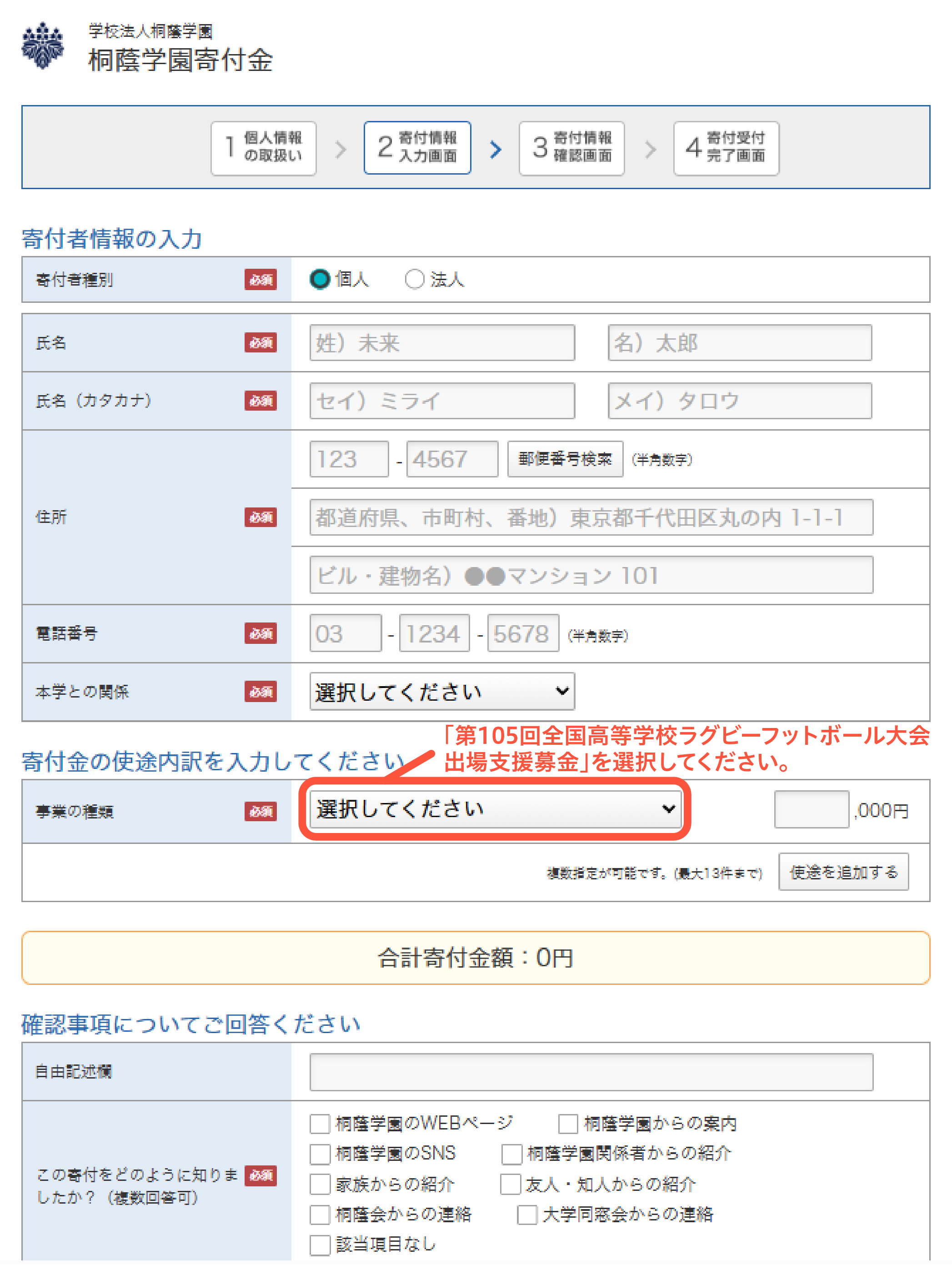 「事業の種類」は「第105回全国高等学校ラグビーフットボール大会出場支援募金」を選択してください。