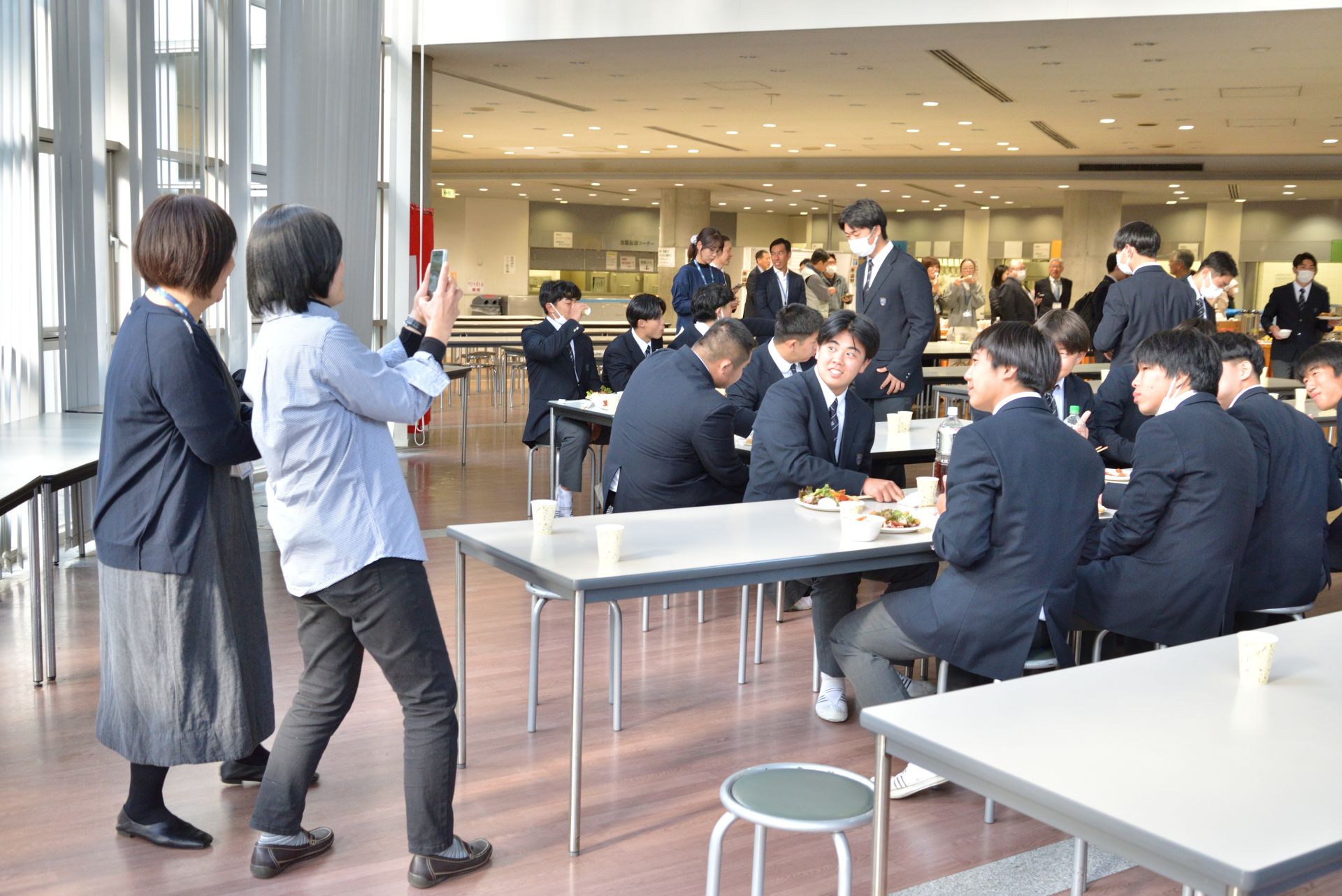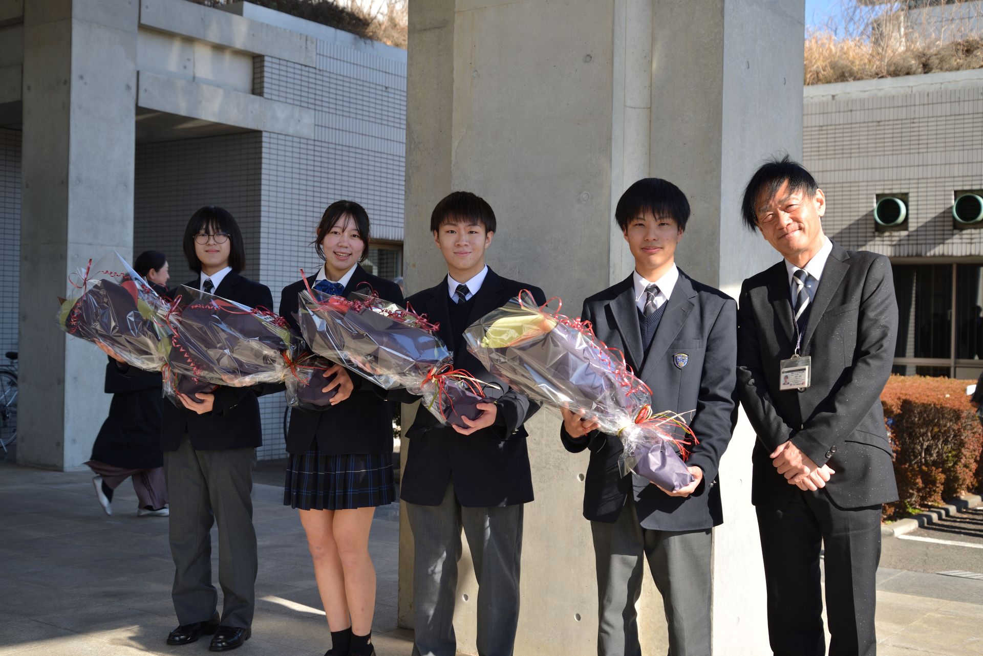 学校に到着した選手たちは、多くの在校生や保護者、教職員に拍手で迎えられ、高等学校生徒会会長、副会長、女子ラグビー部主将より花束が贈呈されました。