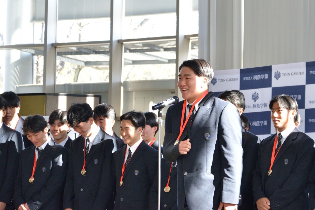 部員のほか保護者や学校関係者が出席した優勝報告会では、藤原秀之監督ならびに堂薗尚悟主将より、大会結果の報告が行われ、偉業達成の喜びとともに、大会期間を通じて支えてくださった皆様への深い感謝の思いが述べられました。