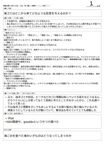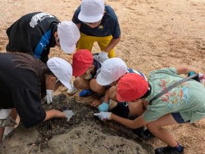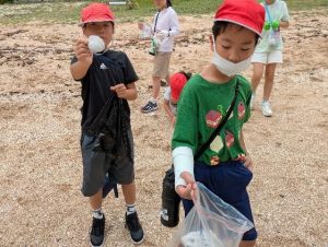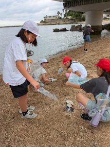 こうした学びをした上で実際に海の様子を、ビーチコーミングを行うことで観察することにしました。ビーチコーミングでは観音崎自然博物館のスタッフ・ボランティアの方々が専門的な知識を持っており、貝や生き物、植物、岩石など様々な質問に答えていただけました。ビーチコーミングをしていると、「ここにもあるよ」「きれいなシーグラスだなぁ」と子どもたちはたくさんのきれいなシーグラスや陶器の破片を見つけました。一方で、「なんでこんなものまで落ちているのだろう」「シーグラスや陶器が貝殻より多いかも知れない」と、思っている以上に人工物がたくさん漂着していることに気付きました。きれいなものやめずらしいものも実はもとをただすと海洋ゴミであり、事前に調べてみたことと実際の様子を目にしたことで実感を持って海洋ゴミの問題を捉えることができました。