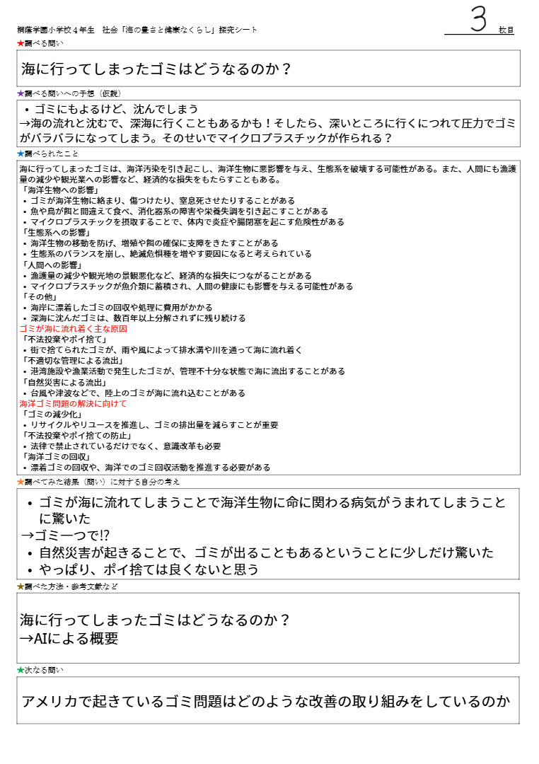 この宿泊は海をテーマとしており、4年生社会科にある水の単元と結びつけながら事前学習を進めていきました。授業の中で、「水の循環」というキーワードを学び、自分たちの健康なくらしにはきれいな水が欠かせず、きれいな水を確保し続けるためには水源や川だけでなく、きれいな海も保たれていかなければならないことに気付きました。そこで、宿泊に向けて海をテーマにした探究的な調べ学習を行い、現在、どのような問題が海にあるのかを1人1人が調べていきました。