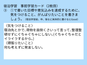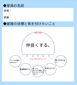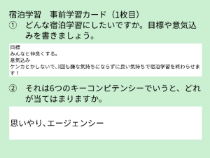 また、クラスメイトと一泊をともにするということも、宿泊学習の大きな学びです。一泊とはいえ、寝食を共にすることは普段の生活とは違って、少し我慢が必要なことも出てきますので、仲間への思いやりの気持ちを意識する必要があります。まずは自分がどんなことに気を付けたいかを考え、それがどのキーコンピテンシーに関わるのかをまとめました。そしてそれを持ち寄って話し合い、部屋ごとに具体的にどんなことに気を付けて、部屋での活動をどのようにしたいかを話し合いシンキングツールでまとめ、それを室員表としました。スケジュールを自分たちで守ることや整理整頓など、声を掛け合って取り組む様子が見受けられました。