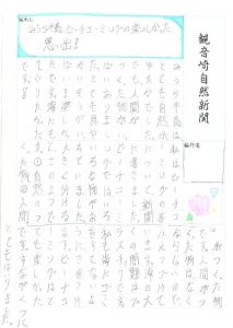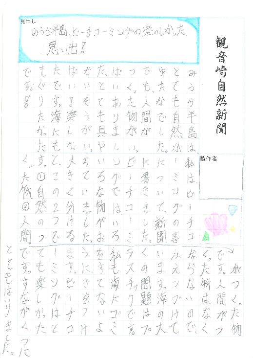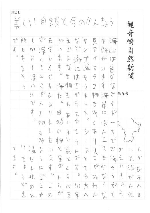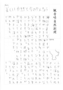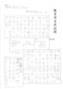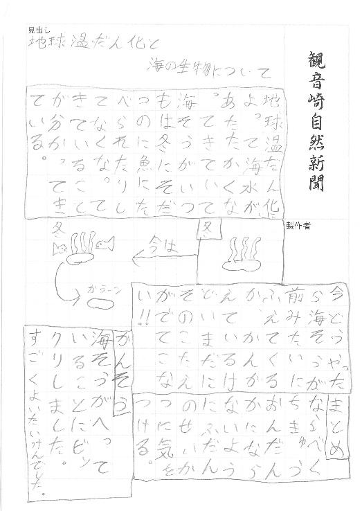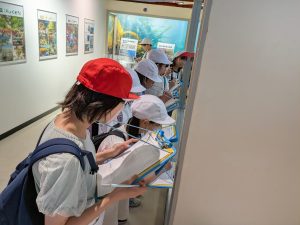 ビーチコーミングが終わったあとは、観音崎自然博物館の中で展示の見学と海藻標本づくり、博物館の方から三浦の海と水産業についてレクチャーを受けました。展示にはタッチプールや相模湾の深海から見つかった生き物の標本など、この場所でしか見られない貴重なものをたくさん見ることができました。この体験したことや見学したこと、学べたことを、国語で学んだ新聞づくりを生かしてB5判のはがき新聞にまとめました。タイトルは「観音崎自然新聞」です。