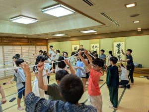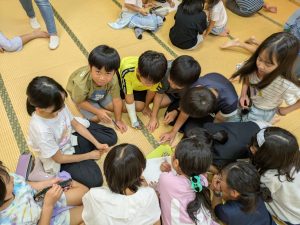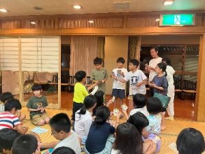 夜はレクリエーションで、クラスごとに考えたレクを学年みんなで行いました。それぞれのクラスが限られた時間の中で話し合い、持ち時間と会場の様子といった条件を考えて、これならば学年全員で楽しくできるのではないか、というものを決めていきました。1組は絵しりとり、2組はビンゴ大会、3組は大根抜きとロープウェーゲームを行い、大いに学年全体で盛り上がり、楽しく宿舎で過ごすことができました。