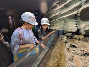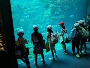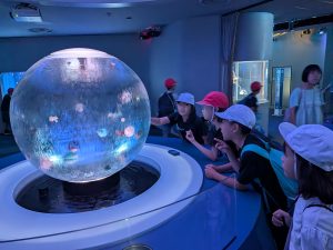 2日目には新江ノ島水族館へ行き、グループで見学を行いました。大迫力の相模湾大水槽など、深海から海岸の生き物まで、多岐にわたる海の生命について学んでいきました。イルカショーでは飼育員の方と息ぴったりなイルカの姿に目を輝かせていました。たくさんの展示がされていますが、単に生き物を観察するだけでなく、その背景にある生態系や科学研究、環境問題まで、幅広い視点での学びができました。
