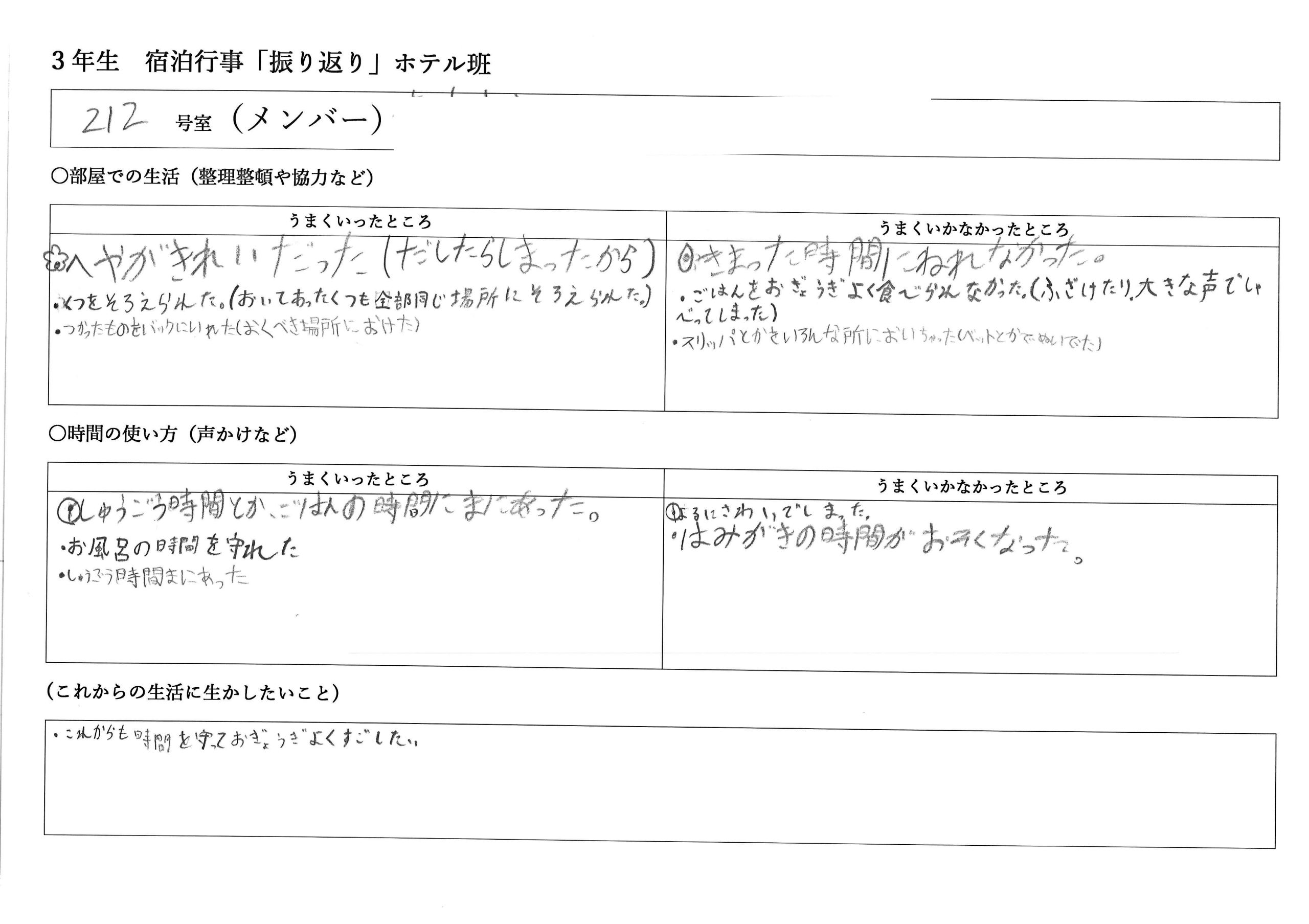 学校に帰ってから、行動班とホテル班での振り返りを行い、学んだことを各班でまとめました。これからの宿泊行事に大きくつながりそうです。