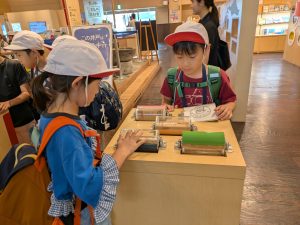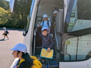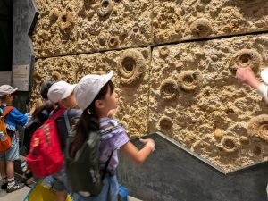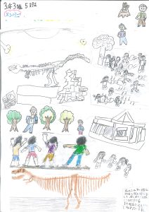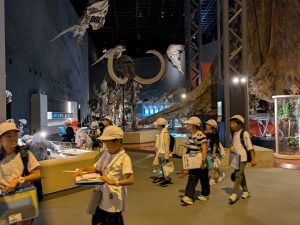 次に訪れたのは「生命の星・地球博物館」です。学芸員さんの話に熱心に耳を傾けて、班での見学では迫力ある恐竜の化石や鉱物の展示に目を輝かせていました。昼食をとった後、一路学校へ。帰りのバスでは、楽しかった活動を振り返りながら友だち同士で感想を語り合う姿が見られました。