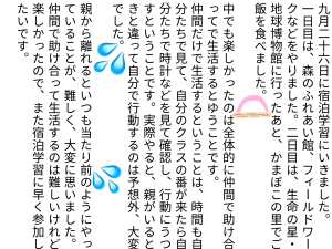 わずか1泊2日ではありましたが、子どもたちは集団生活の中で思いやりを持って行動すること、また新しい体験に挑戦することの大切さを実感しました。これからの学校生活にも、この経験が大きな力となりそうです。