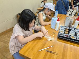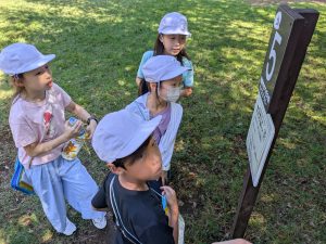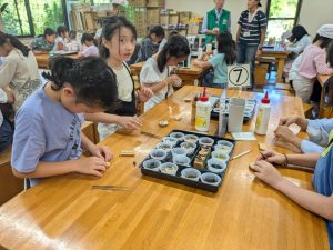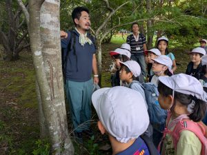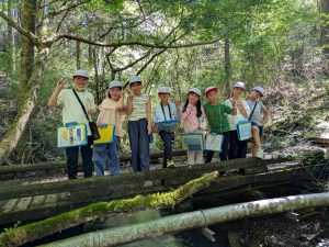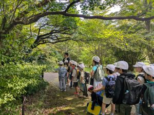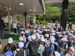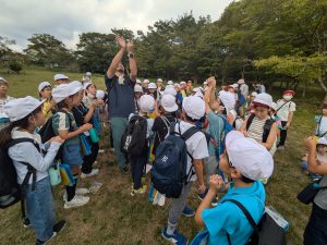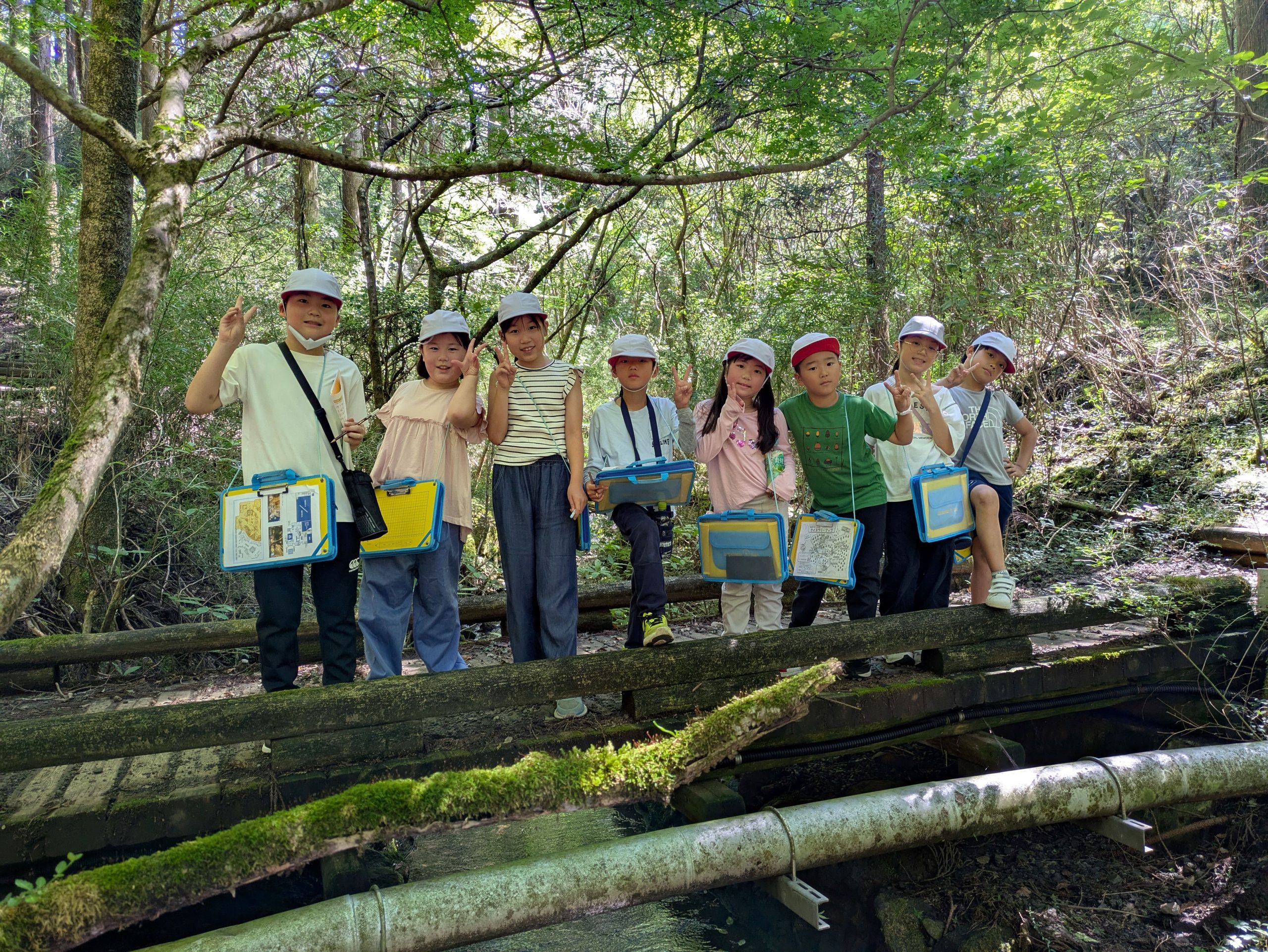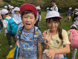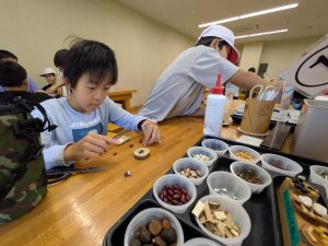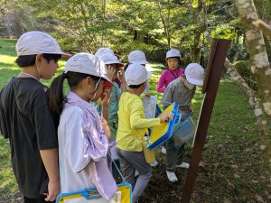学校を出発した子どもたちは、まず「森のふれあい館」へ。クイズラリーではグループごとに森の中を巡りながら協力し、クイズを解きました。クラフト作りでは自然素材を使って思い思いの作品を仕上げました。午後はビジターセンターでのフィールドワークです。センターの方に説明を受けながら、森の中を歩き、植物や虫を見つけ、自然に親しみました。班活動で、仲間同士で声をかけあって、楽しく過ごすことができました。