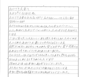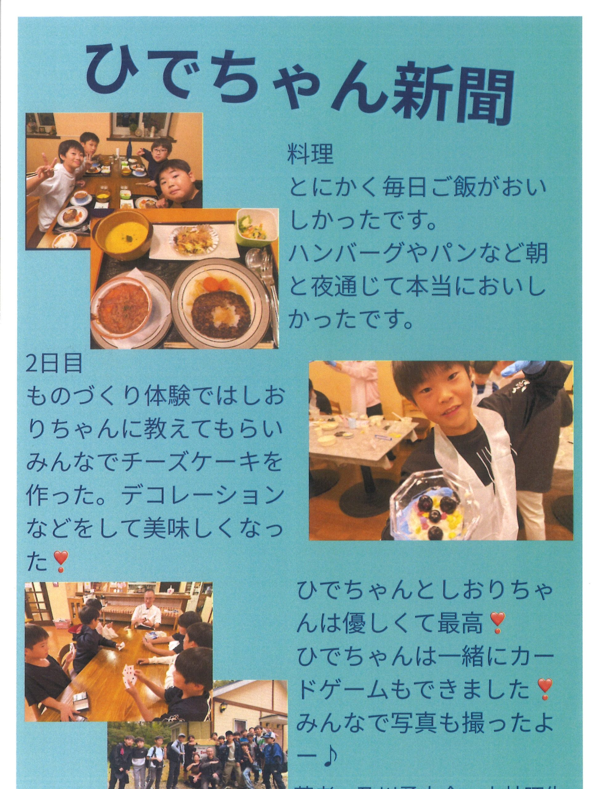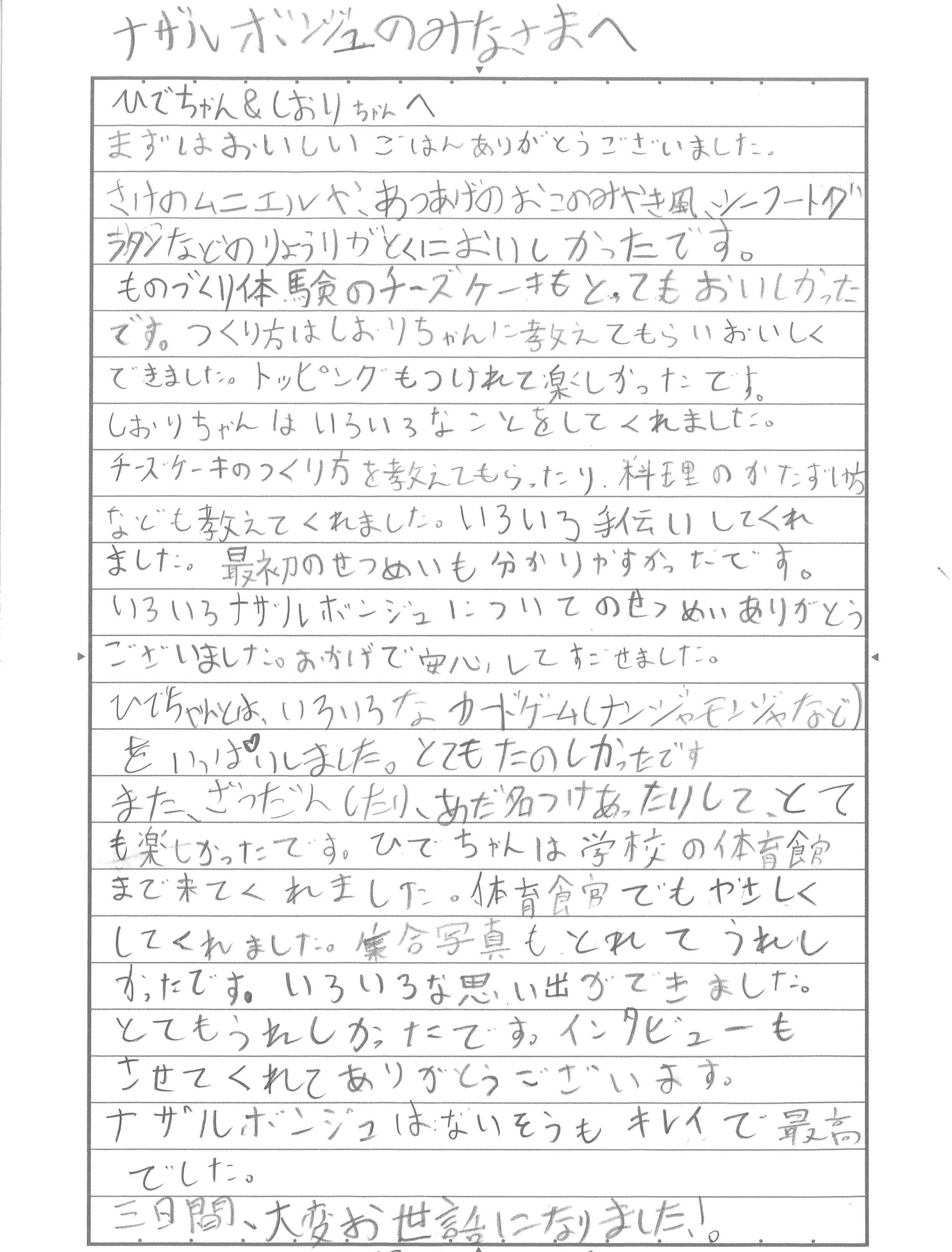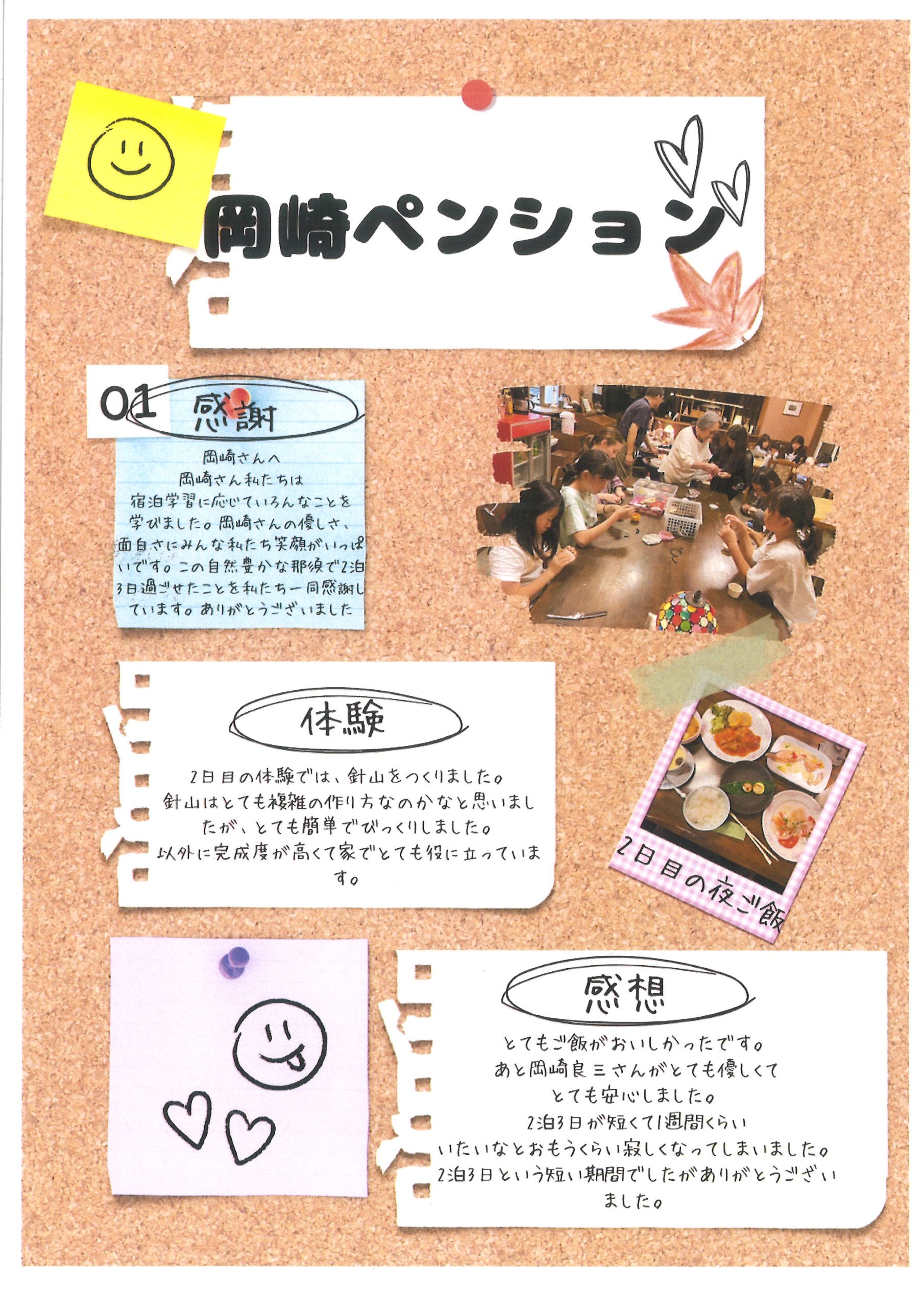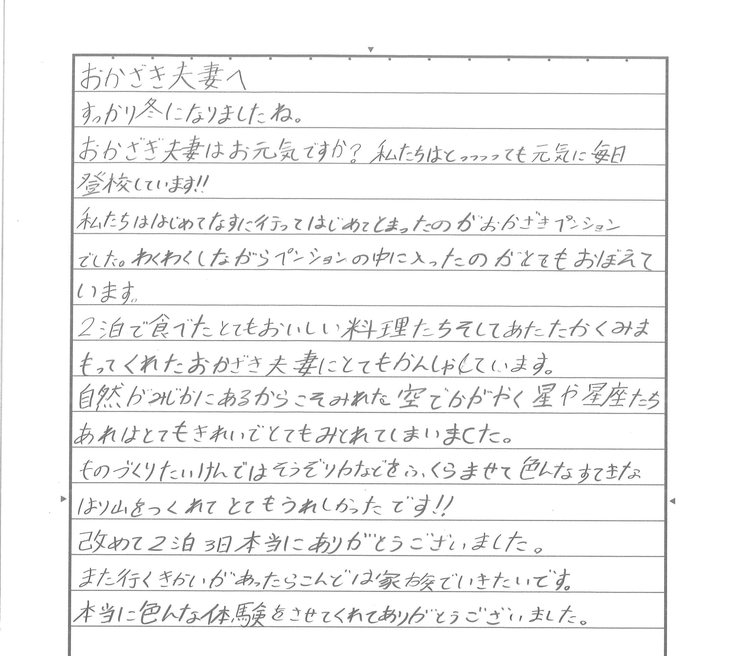 学校に戻ってから、各ペンションでのことを新聞にし、ペンションの方へお手紙を書きました。子どもたちにとってかけがえのない体験になったようです。お手紙や新聞では各オーナーの方への親しみを感じている様子が印象的でした。