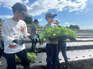 地元の農家さんや酪農家さんの協力で、農業と酪農の体験を行いました。農業体験では、ブロッコリーの苗を植えたり、玉ねぎの種を蒔いたりする作業に取り組みました。この活動では、「学校で経験したお米と今回の野菜作り、同じ食べ物だけど別の手間があるんだ!」と驚く声があり、食べ物が作られるという過程について幅広い学びを得ることができました。