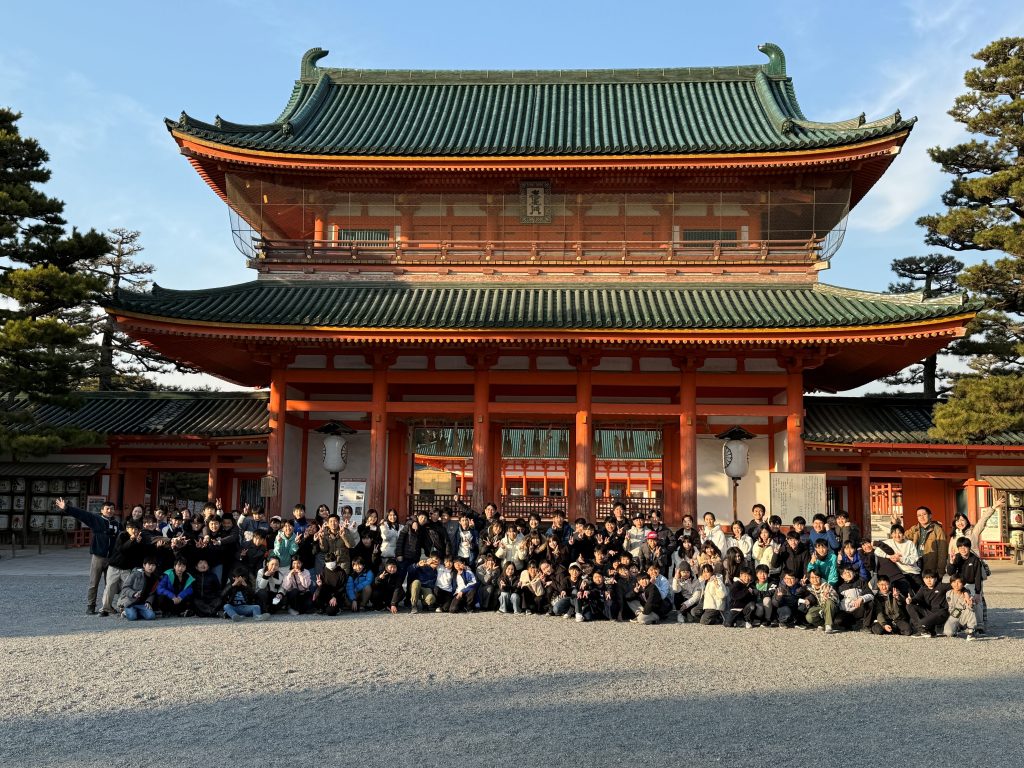 1日目は新横浜から新幹線で京都へ向かい、金閣寺、二条城、平安神宮を見学しました。雲一つない青空のもと、金閣寺がよりいっそう輝いて見えました。実際の建物や空間に触れることで、子どもたちも机上学習だけでは得られない歴史の重みを実感しているようでした。