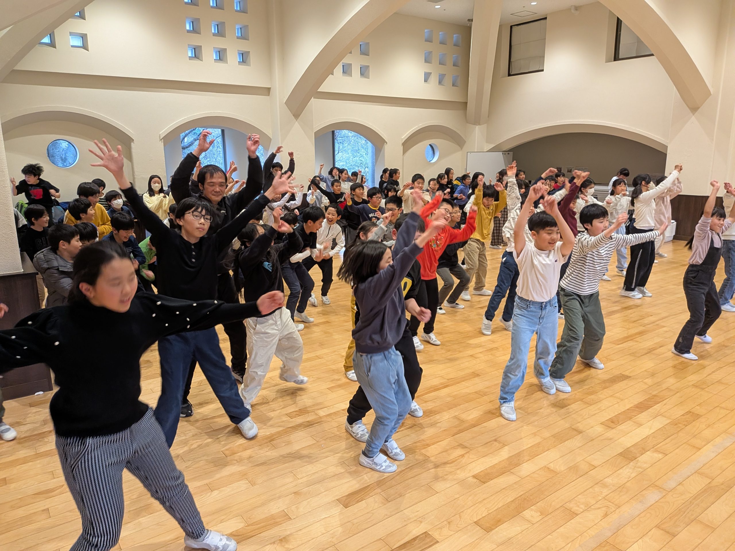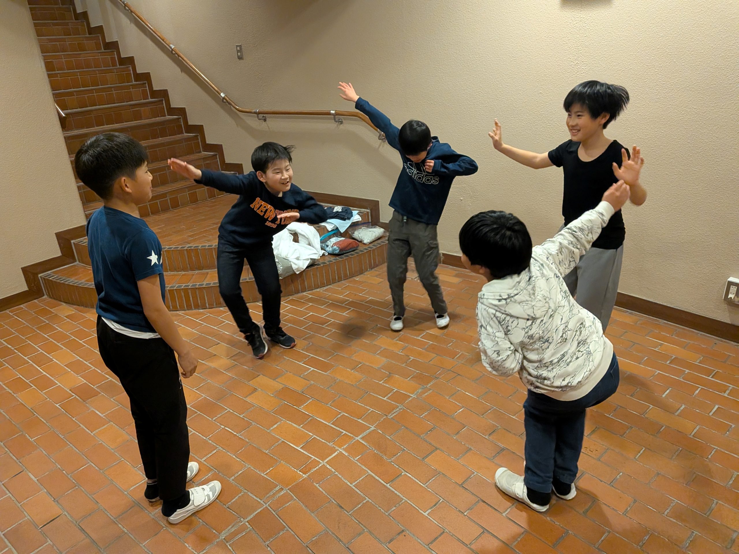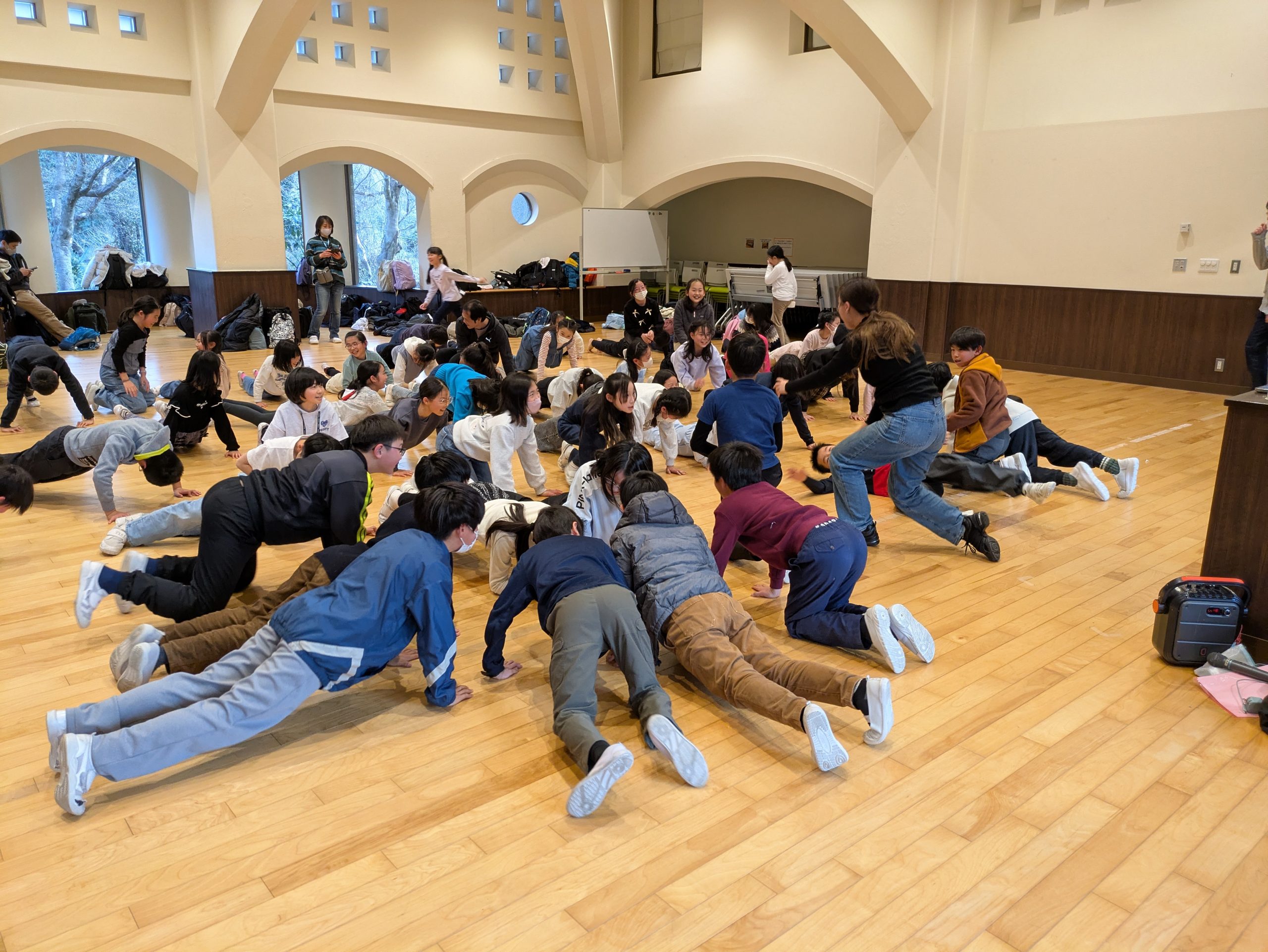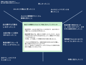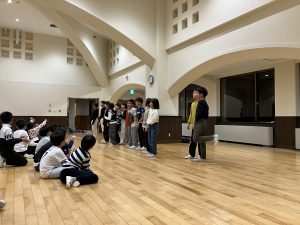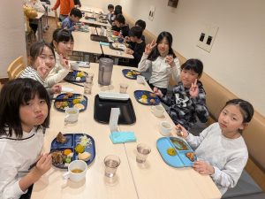 今回の宿泊では「自分たちのことは自分たちでしっかり行う」「協力」を目標にして、各活動を行いました。1日目のチームビルディング研修プログラムでは、ペアやグループで「協力」して課題に取り組みました。最初は恥ずかしがっていた児童もテンポ良い流れやスタッフの方の場を盛り上げる声掛けもあり、徐々に慣れてきて「自分たちでグループになってダンスを創作する」ことで自己表現することを楽しんでいました。