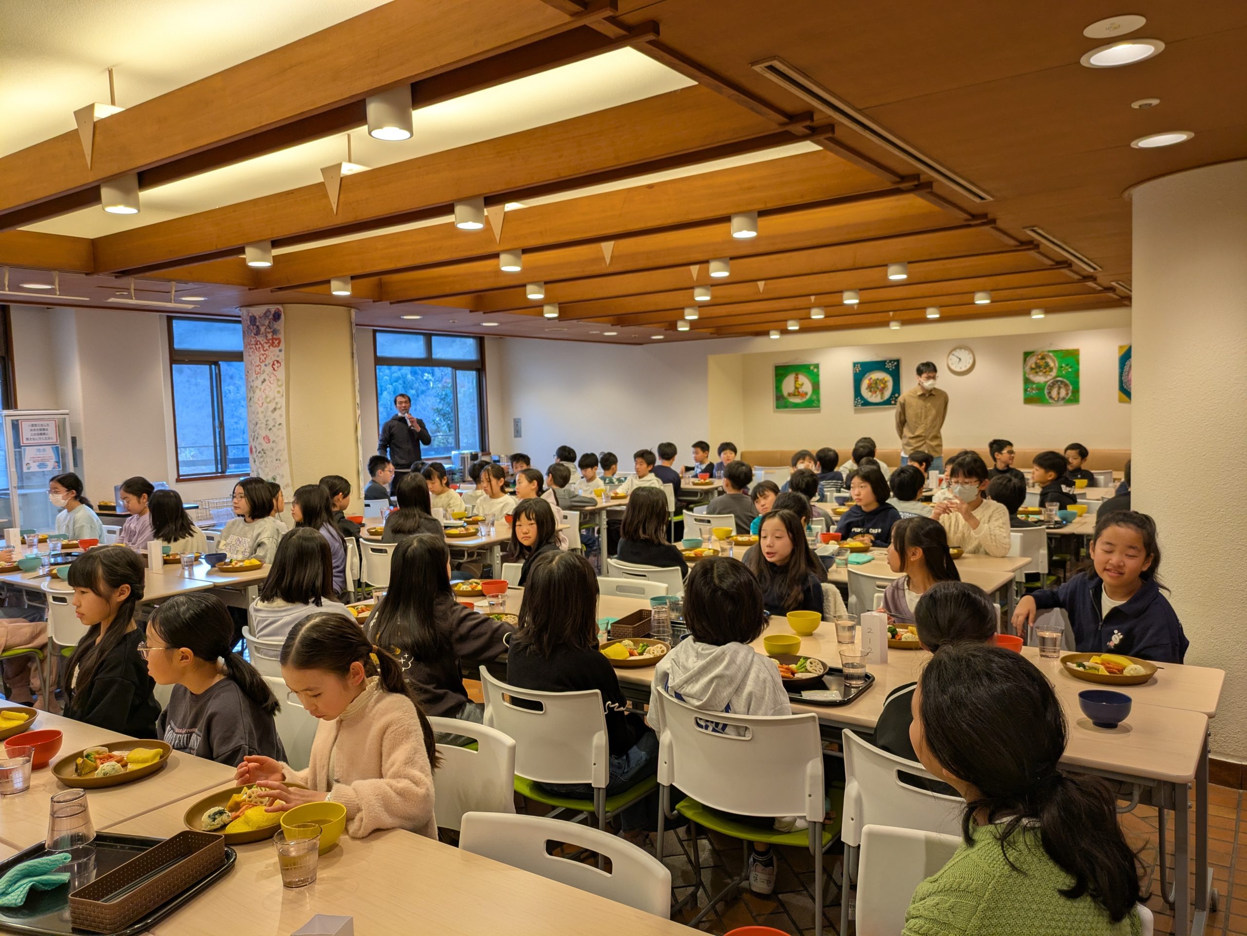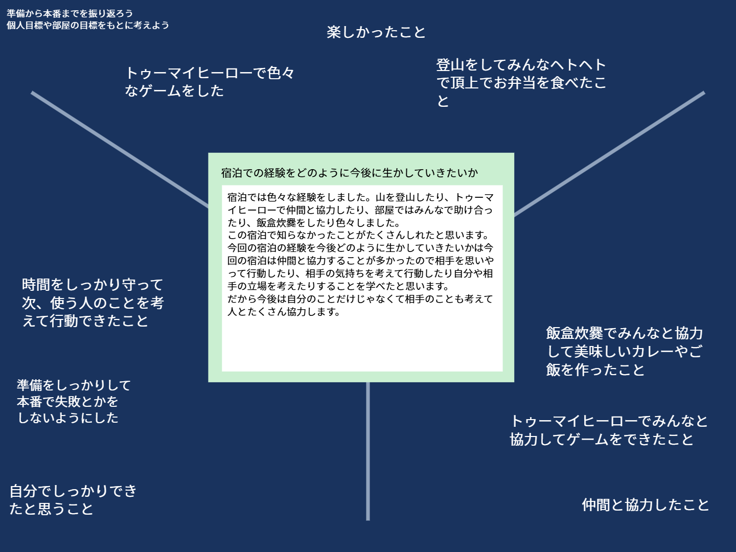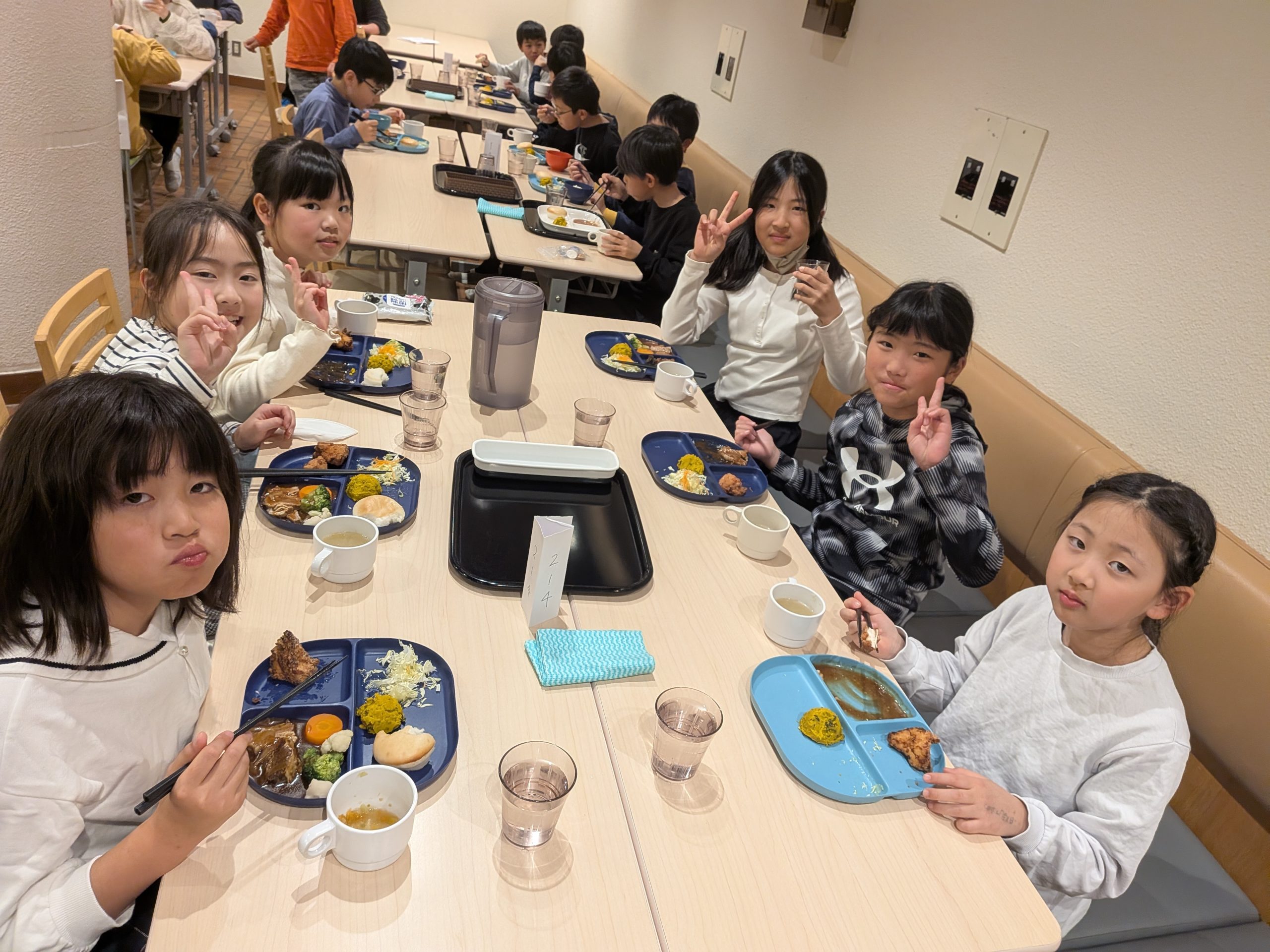 宿泊場所はホテルではなく研修施設なので、ベッドメイキングも自分たちでやらなければいけません。食事のときにはお水やスープの配膳手伝いもしました。食後も個人で食器を種類ごとに片づけ、ゴミを種類ごとに分別して捨てることもしましたが、普段の給食でも継続して行っていることもあり円滑に行うことができました。9月の宿泊の振り返りを活かしてスケジュールを自分たちで守ることや整理整頓など、声を掛け合って取り組む様子が見受けられました。