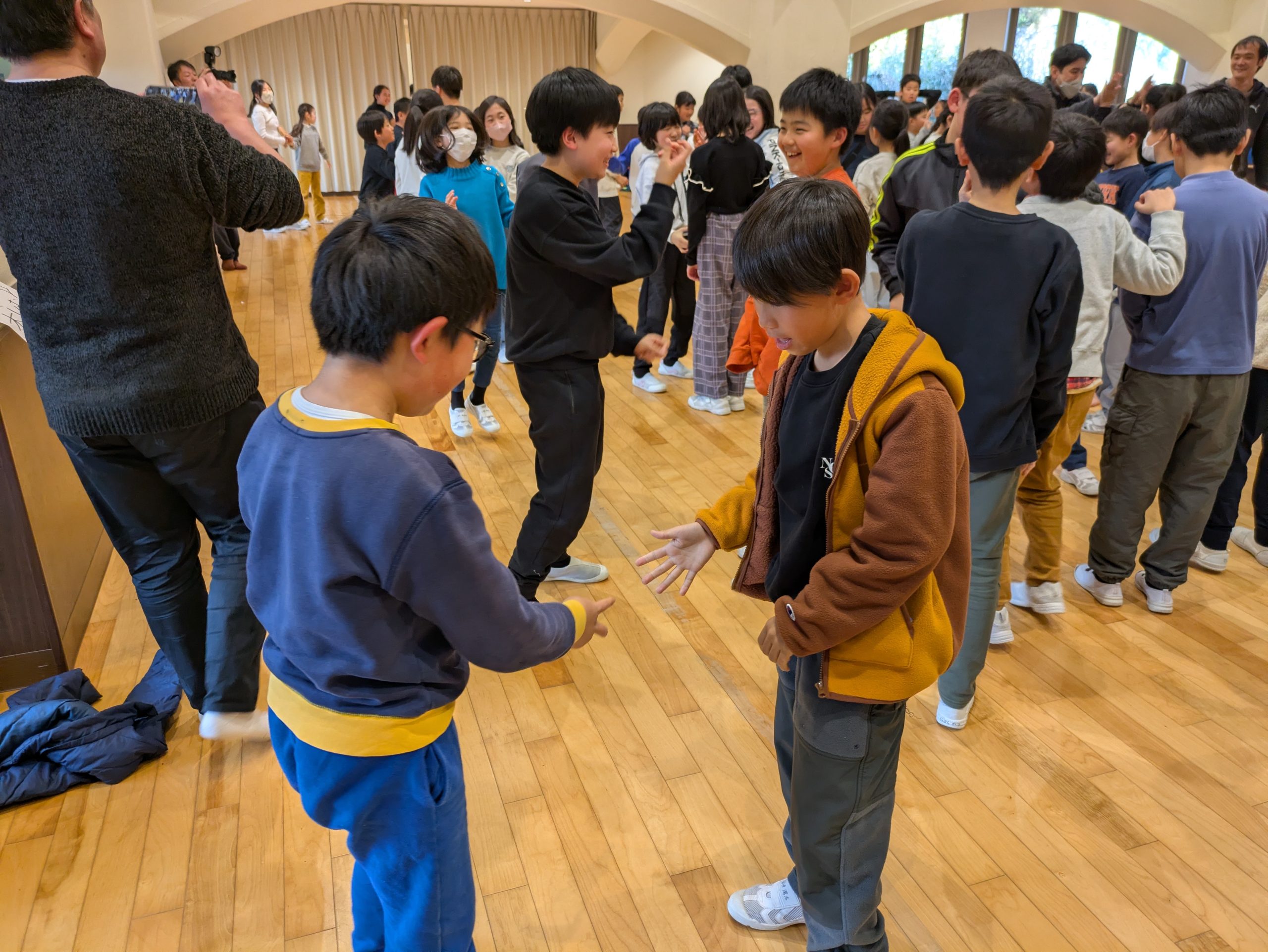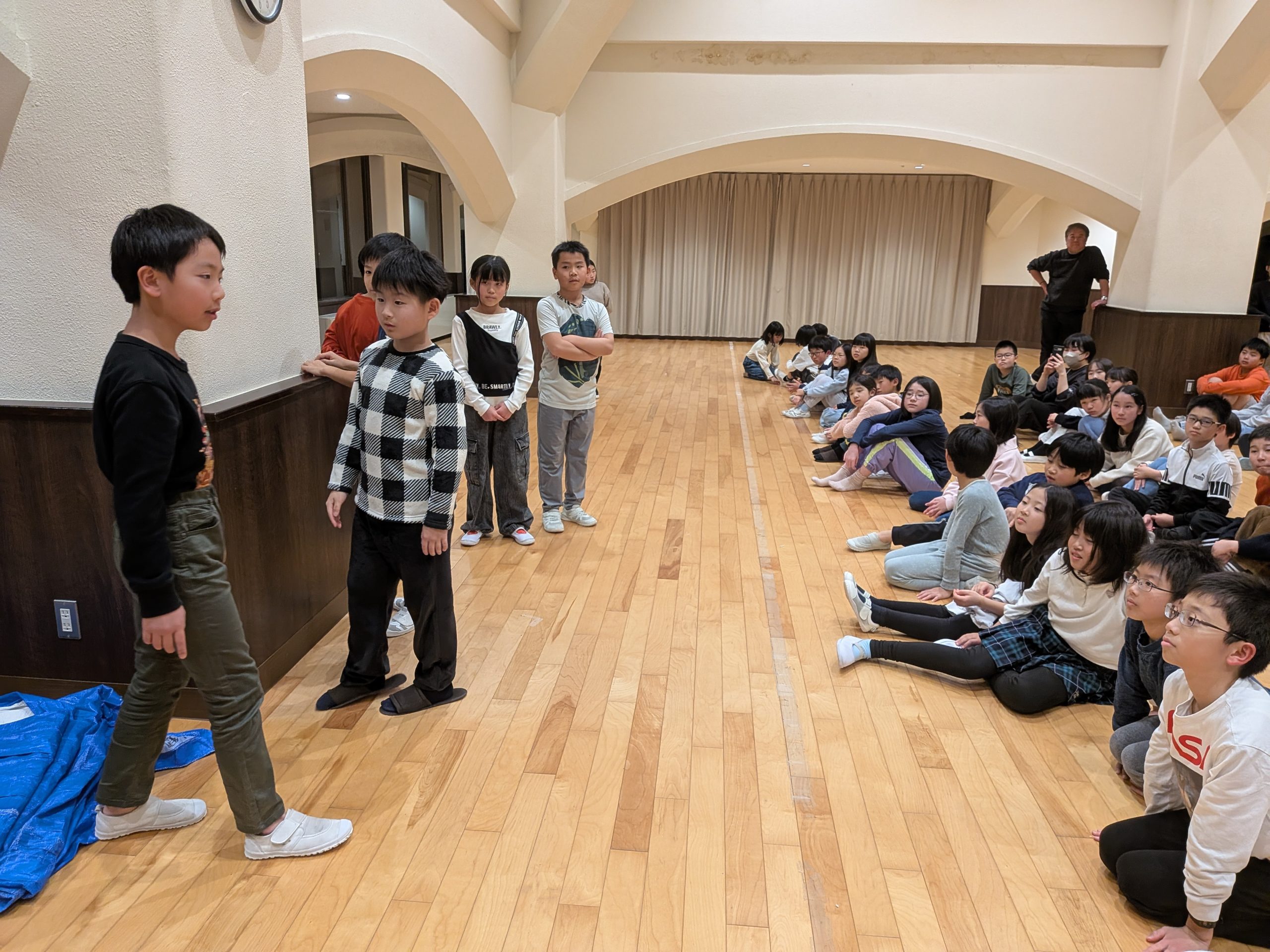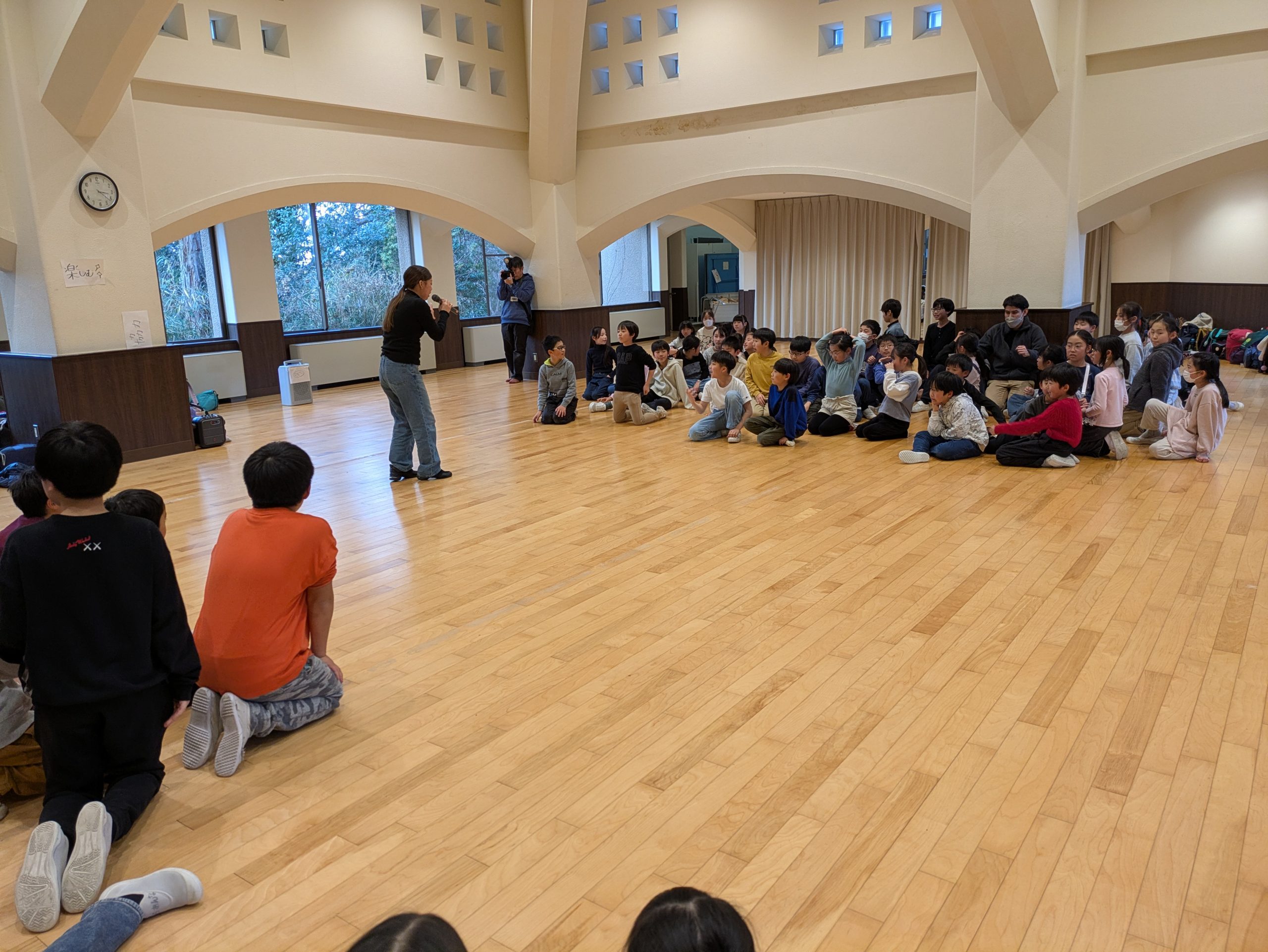 夕食後はレクリエーション係の主催でレクを学年全員で行いました。事前にレク係を募集して学校生活の休み時間など限られた時間の中で企画と練習に取り組んできました。レク係は司会進行やゲーム説明を役割分担して盛り上げようと頑張っていました。その熱量に押されて他の児童たちも○×ゲームなどで大いに学年全体で盛り上がり、楽しい時間を過ごしてよい1日を終えました。