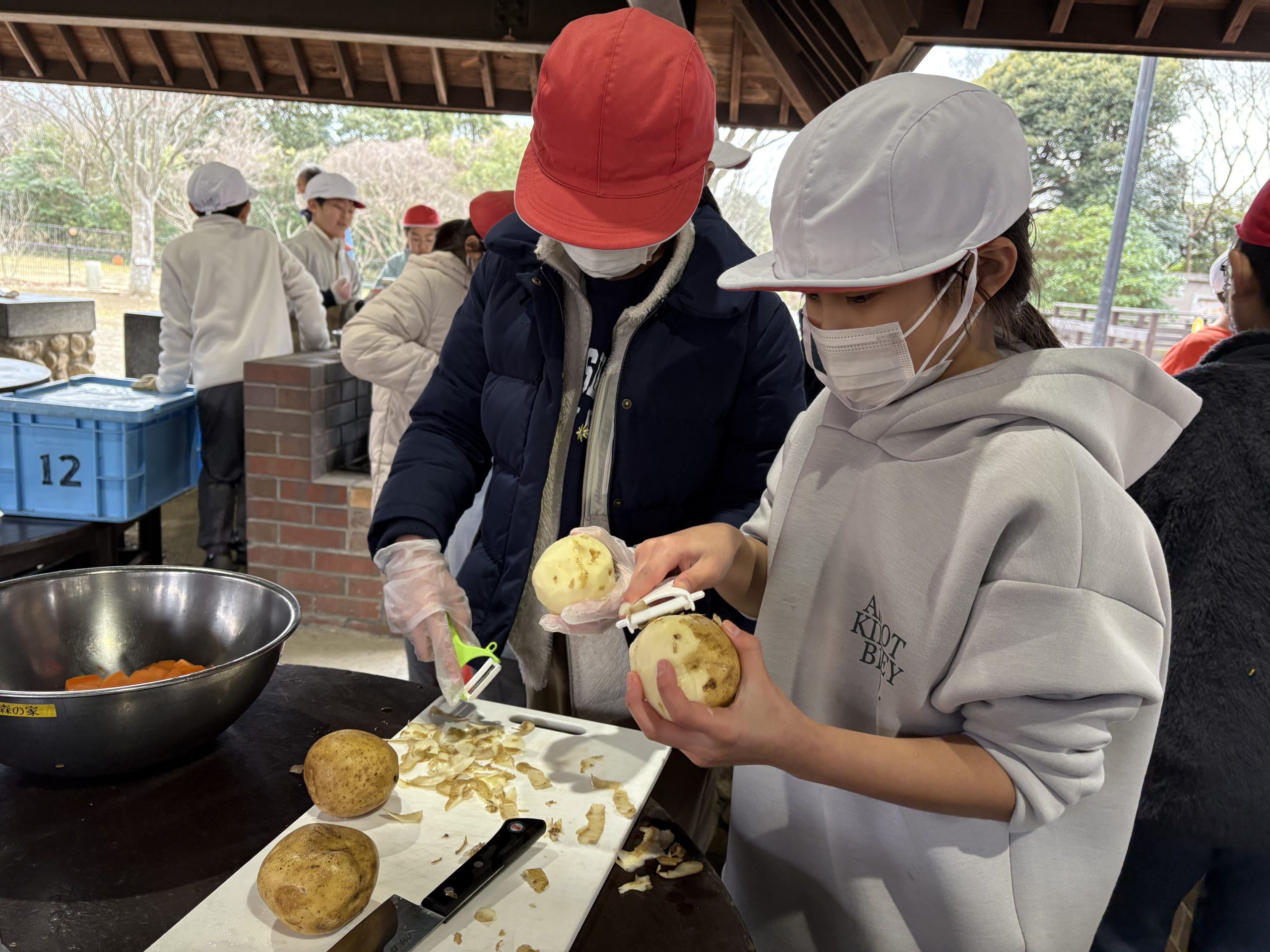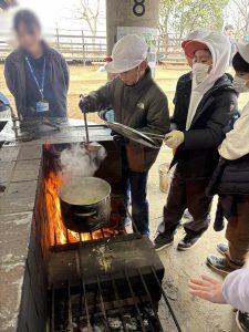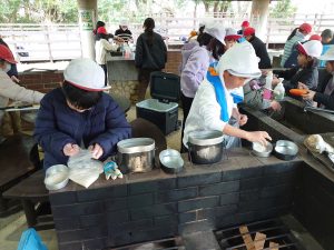 2日目は部屋の片付けと荷物出しの後、今回の宿泊行事の最大イベントである飯盒炊爨を行いました。事前にカレーの作り方を調べたり、実際に家で料理に挑戦したりした取り組みを実際に試してみる場となりました。カレー作りは全てを自分たちで行わなければなりません。手分けして作業をする中で自然と「○○やっておくね」「手伝おうか?」「切るのが上手だね」と協力をしたり、相手の良さを認めたりする言葉が聞こえてきました。飯盒炊爨について教えてくださった宿舎の方からも、「協力する姿勢がとても良いですね。」と言っていただけました。宿泊後の振り返りでは、特に飯盒炊爨を通じて、協力の大切さに触れている内容が多く見受けられました。ここで培った自立心と協力する姿勢を活かし、4月から始まる高学年としてのさらなる飛躍を期待しています。