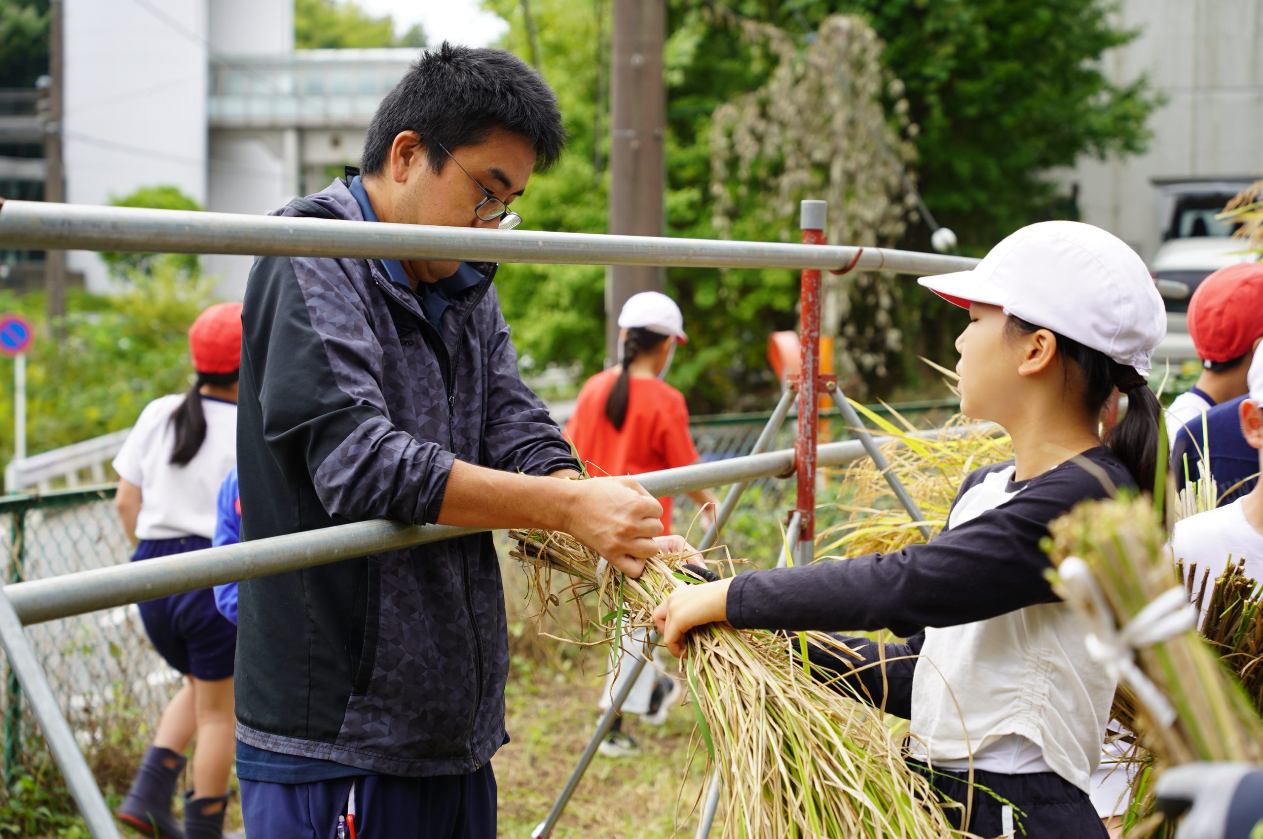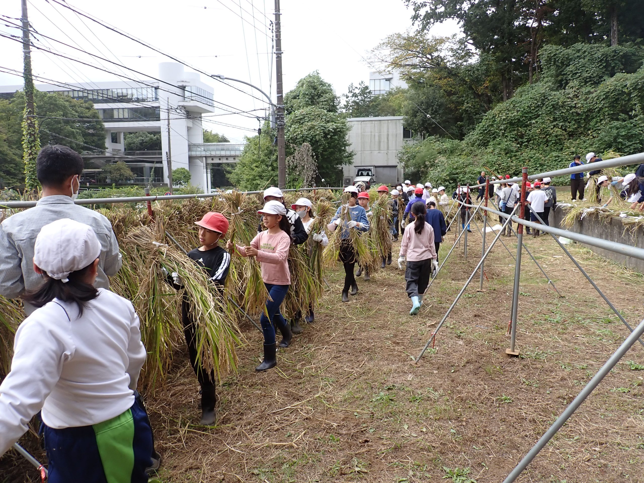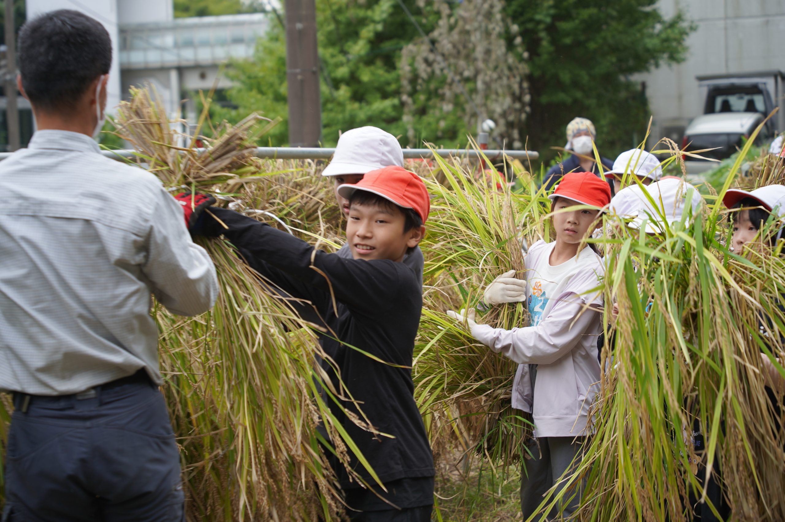 子どもたちからは、「ほぼ一年をかけて行う米作りはとても大変だと感じた。桐蔭の田んぼだけでもこの大変さだから、農家さんはもっと苦労していると思う。」「米作りは苗を植えたり除草したり、稲を刈って干したりと重労働。だからこそ米の高騰につながっているのかなと思った。」といった、体験を通して学習内容を結びつけた感想が聞かれました。そして、今年は第四幕【調理実習】へと続きます。自分たちで刈り取った稲を脱穀・精米し、精米されたもち米を使って「おこわ」を作る予定です。「植える」「育てる」「刈る」「食べる」という一連の流れを自分たちの手で体験することで、子どもたちはさまざまな視点から考え、感じ、思いを深めていくことでしょう。営繕部の皆様をはじめ、ご協力いただいたすべての方々に心より感謝申し上げます。