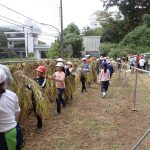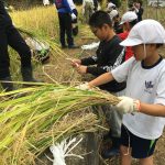 5年生は一年を通して「米」に大きく関わっていきます。第一幕は【田植え】。今回はその第三幕【稲刈り】を行いました。晴天の下、多くの保護者や営繕部の方々に見守られながらの活動となりました。