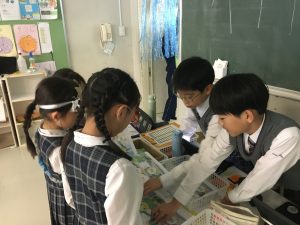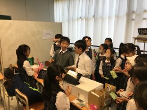 受付での準備では、お客さんが楽しめるようにスタンプを用意して、楽しく、回れるようにしました。そして、受付ではお客さんが使ったゴミなどを回収する、ゴミ箱を用意しました。そして5年2組でお客さんが楽しめるように、音楽を流して、盛り上げたいと思い、音楽を流しました。