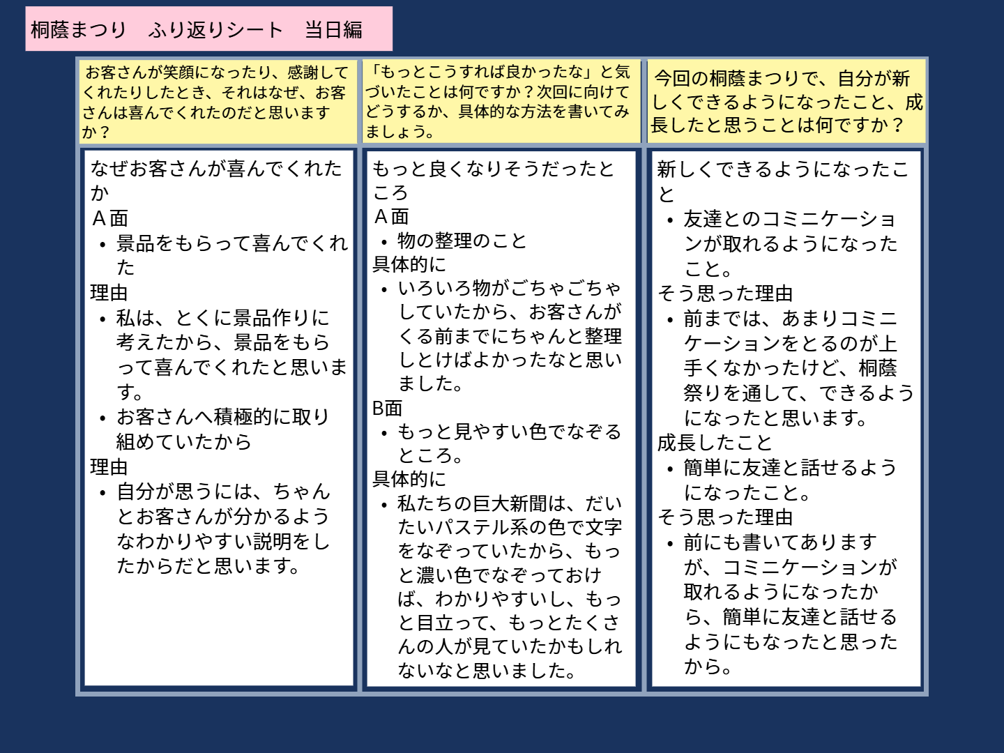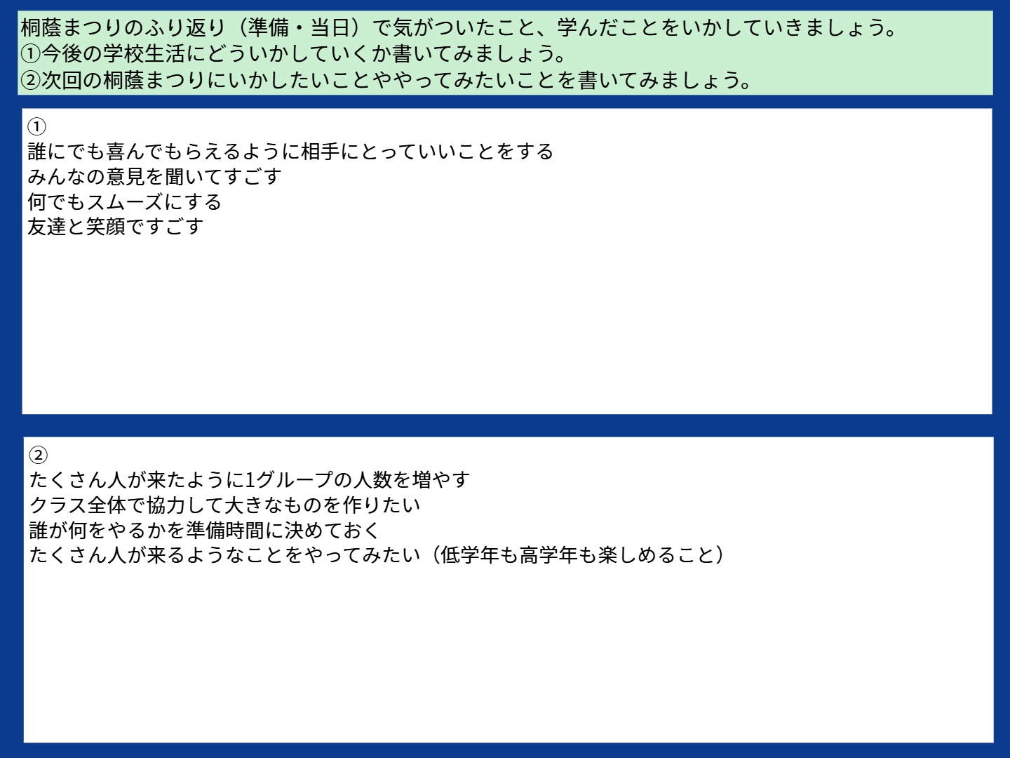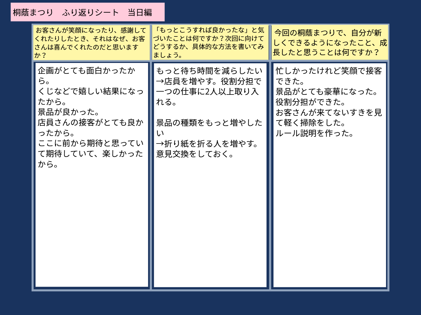 片付けが終わったあと、今回のおまつりの振り返りを行いました。準備や当日のことだけでなく、次を見据えて今回で得られたこと、次につなげていきたいことをまとめました。上級生の企画を見て、刺激を受けたようです。今回の取り組みで学んだことを生かして、また来年素晴らしいものをみんなで作り上げてもらいたいと思います。
