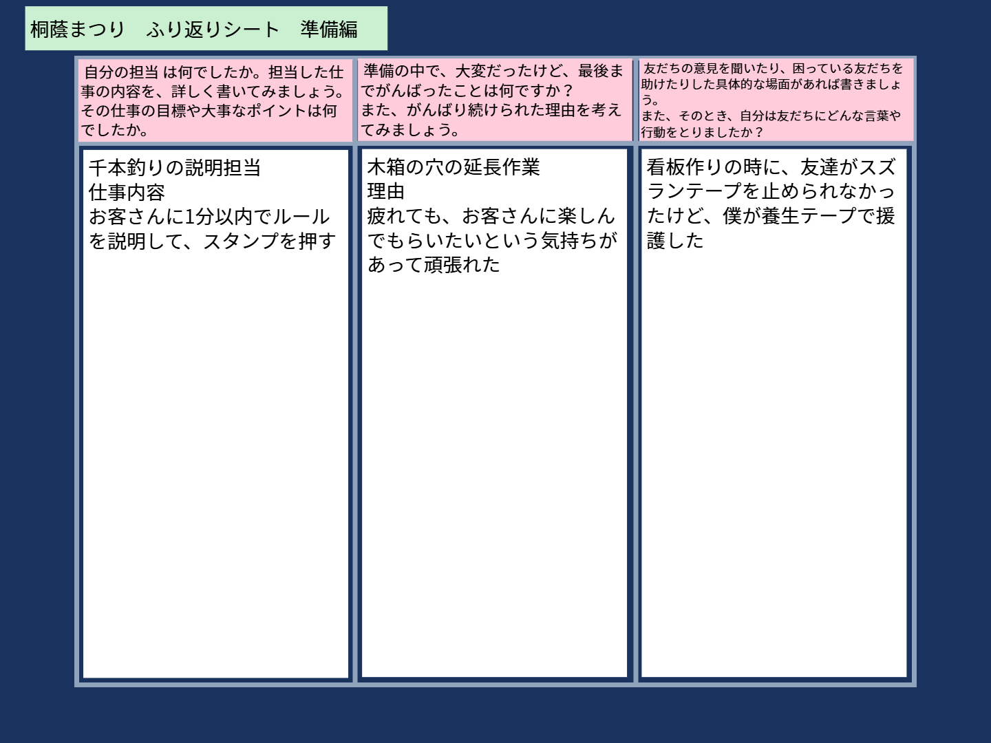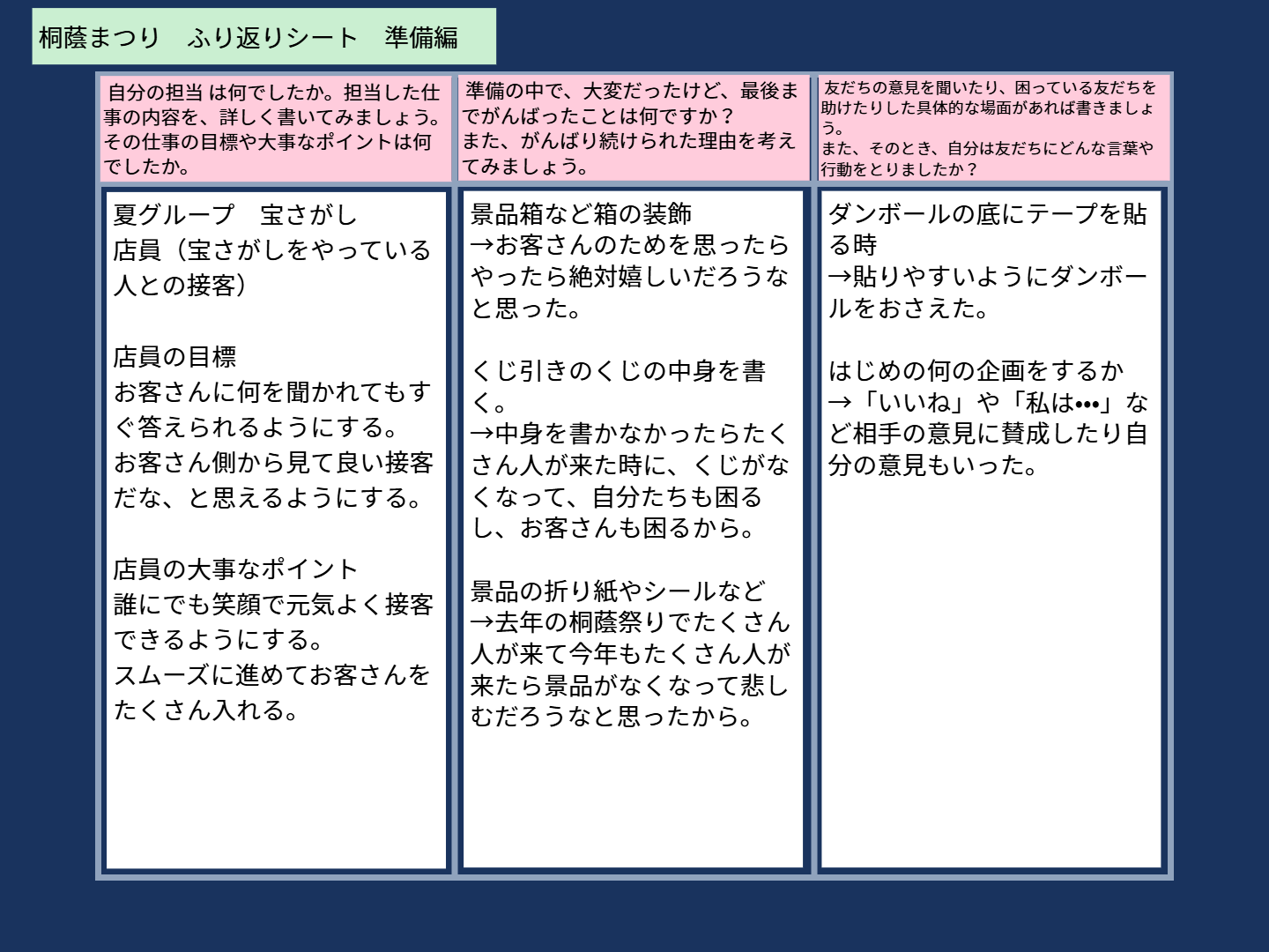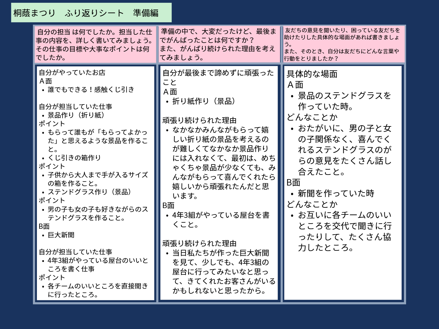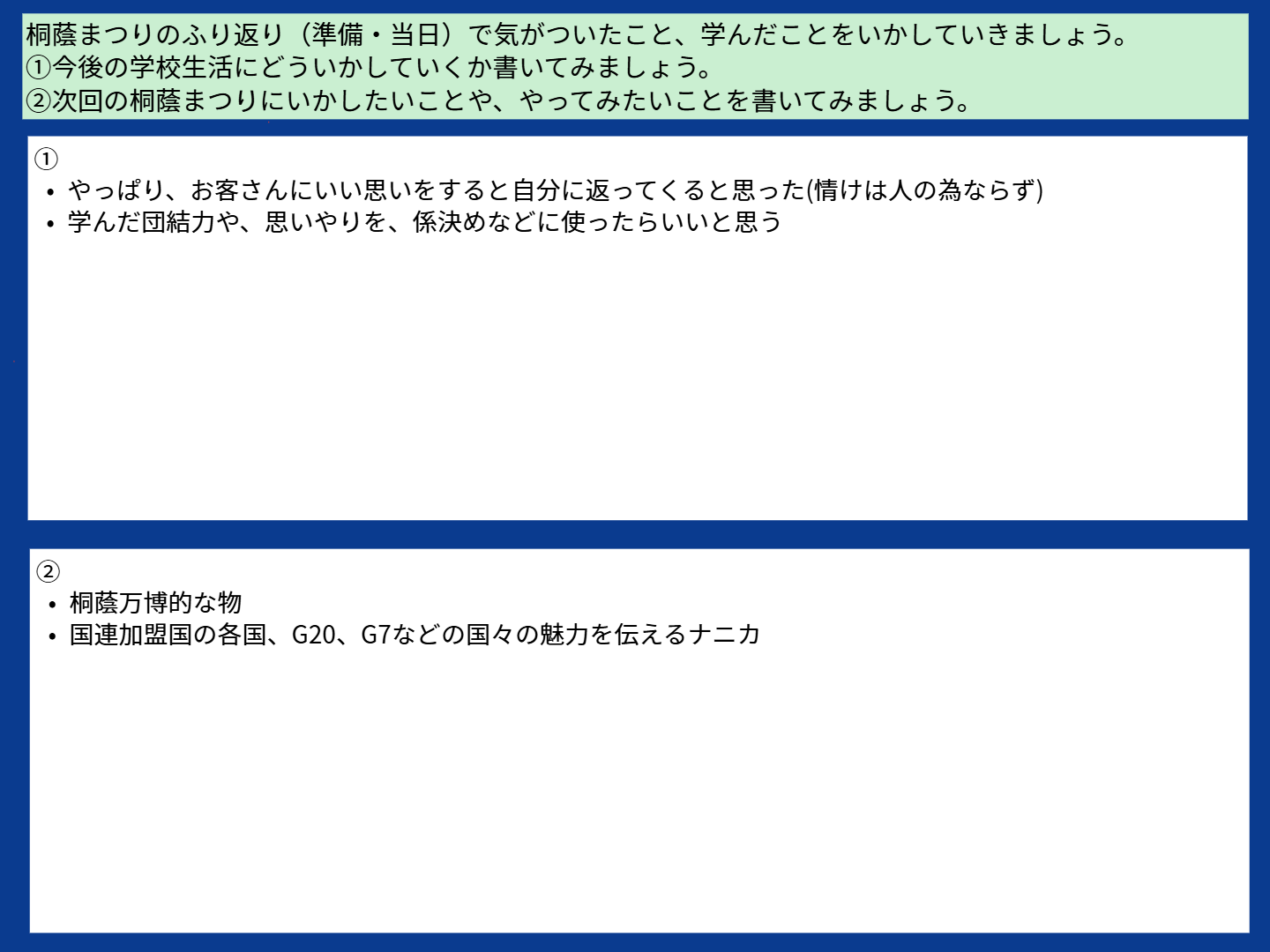 片付けが終わったあと、今回のおまつりの振り返りを行いました。準備や当日のことだけでなく、次を見据えて今回で得られたこと、次につなげていきたいことをまとめました。上級生の企画を見て、刺激を受けたようです。今回の取り組みで学んだことを生かして、また来年素晴らしいものをみんなで作り上げてもらいたいと思います。