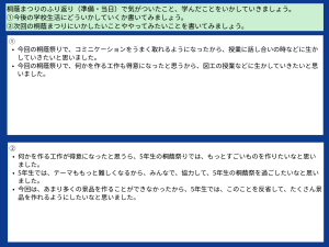 子どもたちは、準備から本番までを通して「クラスで協力すれば、難しいことでも乗り越えられる」ということを、学び、成長することができたと思います。