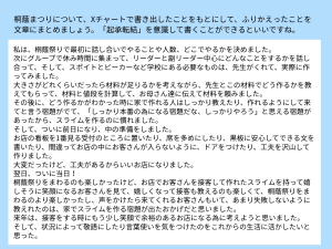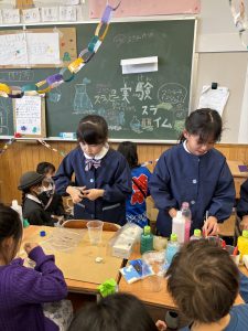 サイエンスをテーマに、自分たちがやりたいことが縁日形式でまとまり、「実験(スライム作り)」「工作(レジン作り・植物の折り紙)」の3つの企画を行いました。当日の企画がスムーズに進むためにどうしればよいか、予備実験を繰り返し、よりよいやり方を模索しながら準備を進めました。