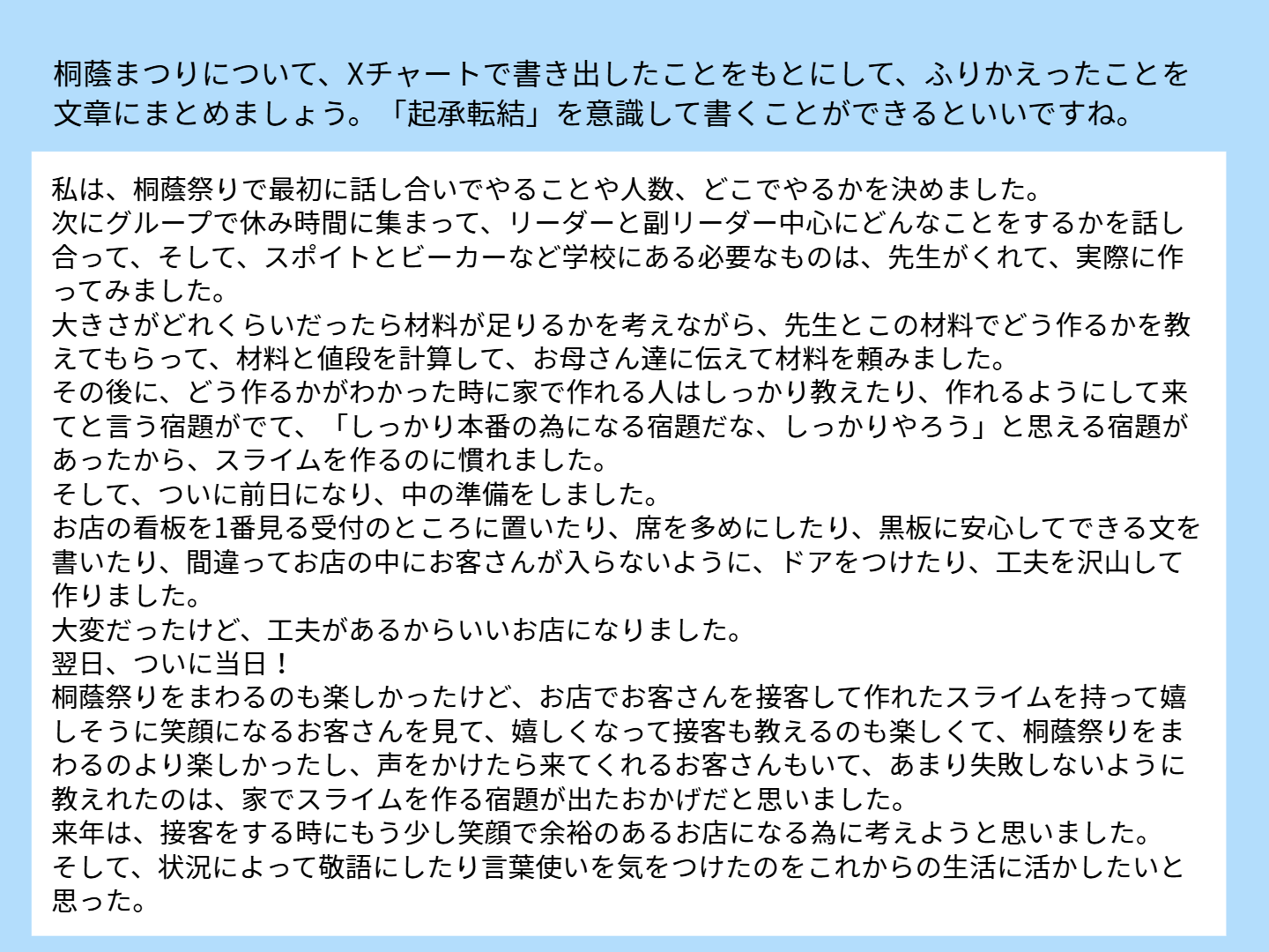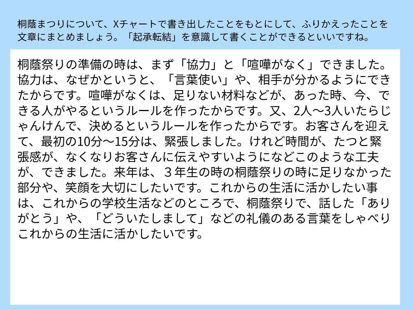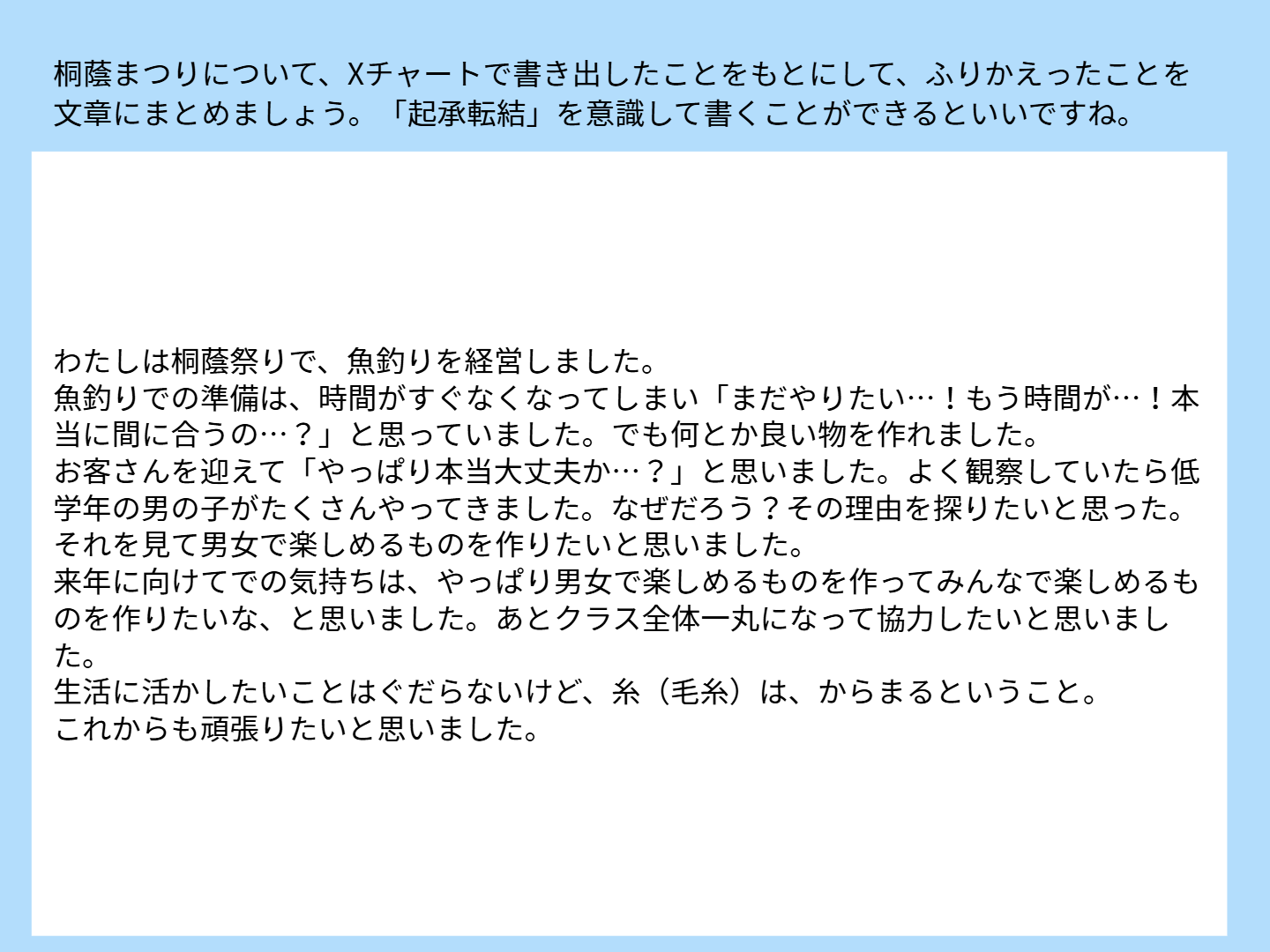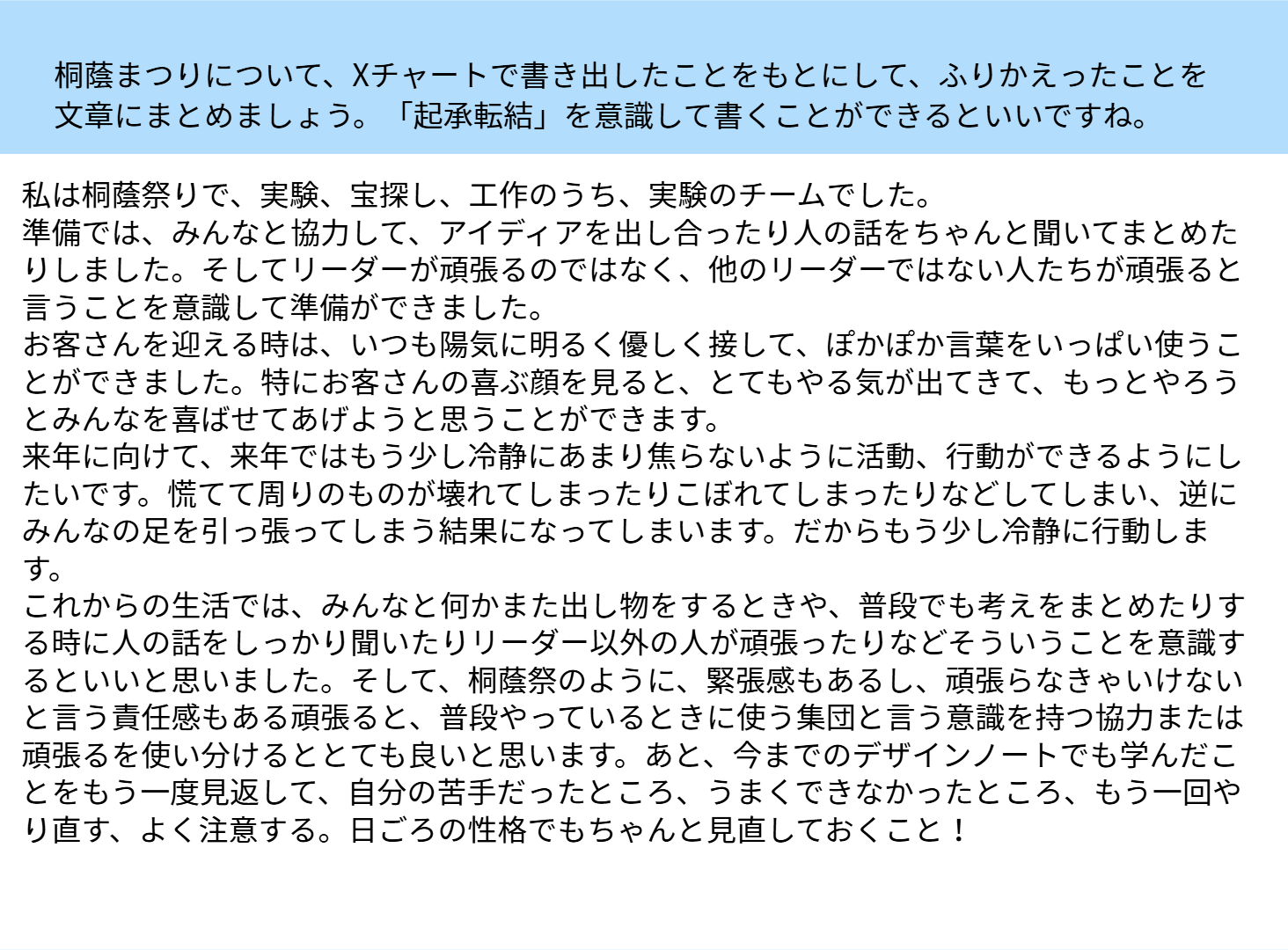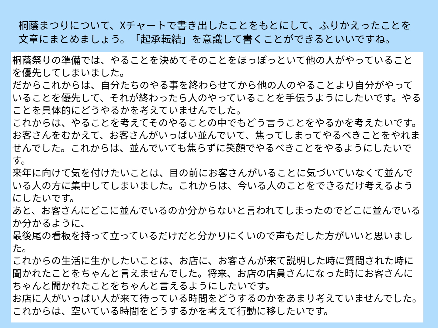 まつりが終わり、あっという間に片づけを行うと、はかなさを実感するのと二か月間におよぶ準備が充実していたことを振り返ることができました。この今年の経験を生かし、来年の桐蔭まつりではさらにレベルアップした姿を見せてくれたらと思います。