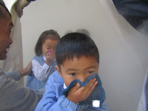 保育室の窓から消防車が見えると、子どもたちは大興奮!本物の消防車が幼稚園に来てくれて、びっくりしていました。園長先生の放送で園庭に避難した後は、テントで煙体験をしました。テントの中は白い煙でいっぱい!この煙はなんと甘い香りがしました。この甘い香りを吸わないように、ハンカチで口を押さえてテントの中を歩きました。白い煙で先が全く見えず、少し怖かったです。声を頼りに出口までたどり着きましたが、壁をつたって歩いていくのがいいそうです。