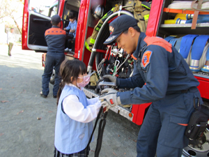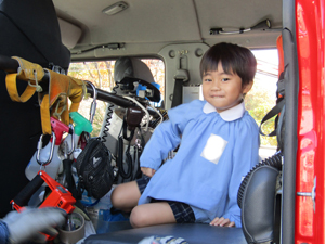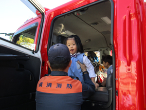 その後、消防車の中にはどんな物があるのか見せてもらったり、消防車に乗せてもらったりしました。消防士さんのお話を聞いて、普段どんなお仕事をしているのかもわかりました。子どもたちが消防士さんの仕事を知る良い機会になりました。