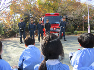 先日、火災による避難訓練を行いました。近くの消防署のご協力をいただき、消防士の皆さんが消防車で幼稚園へ来てくださいました。