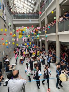 その後、全生徒で紙飛行機を飛ばし、雰囲気を盛り上げます。紙飛行機が楽器に当たらないよう、吹奏楽部が傘を差しているのがいいですね笑。