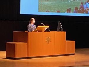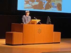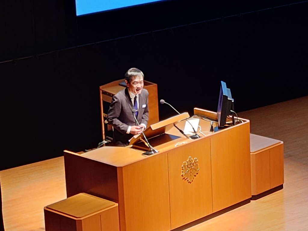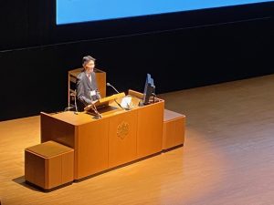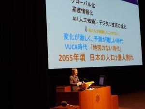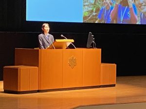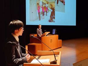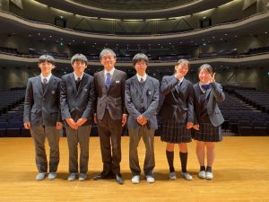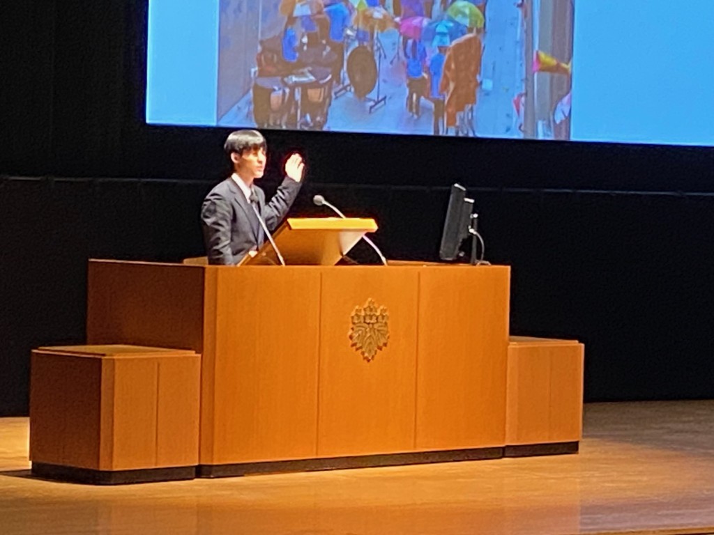 そして、午後の部は司会も生徒が担当してくれました。生徒会長の小山慶悟さん(2年)。事前打ち合わせ無し、私からの突然の質問にも見事に反応してくれました。頼もしい。会場からは大きな拍手が。