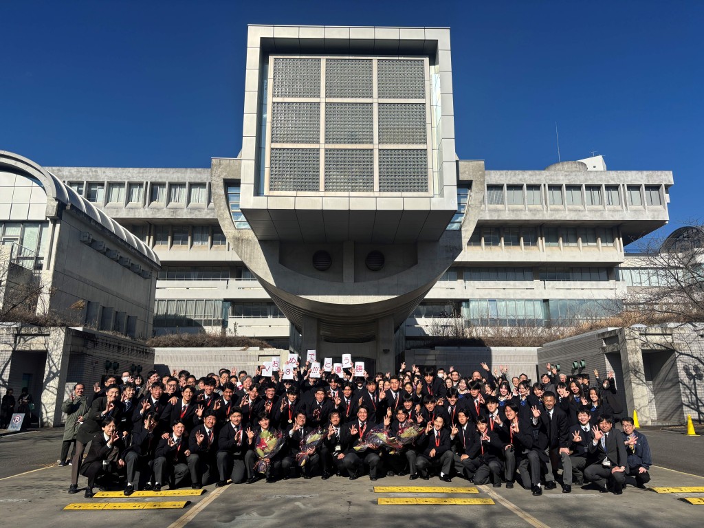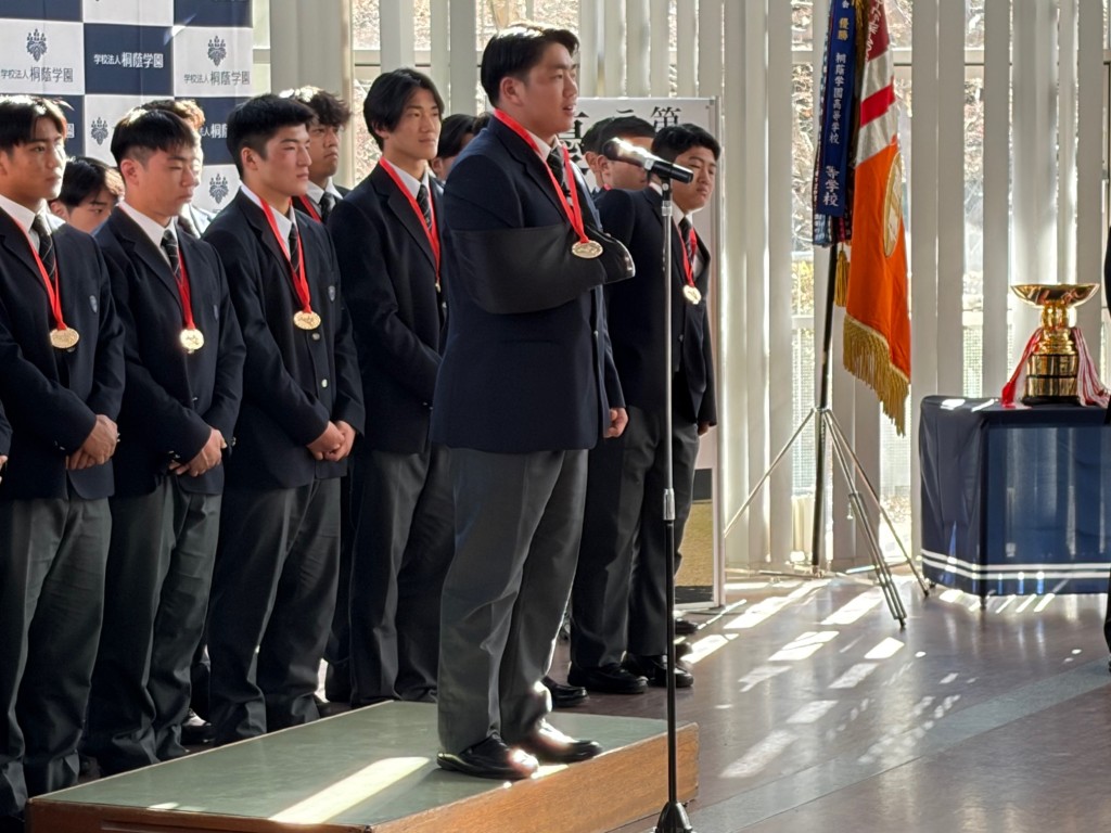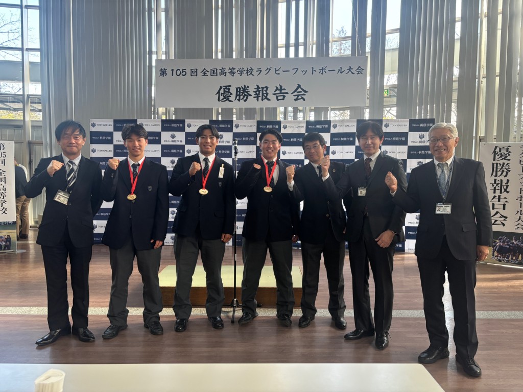 昨日(1/7 水)、花園全国大会で優勝を決めた高校男子ラグビー部が、学校に戻ってきました。多くの在校生や教職員から大きな拍手で迎えられ、校舎の前で記念写真。