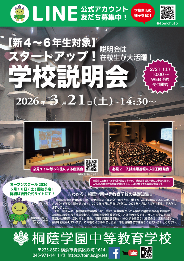 この学校説明会は、2月21日(土)10時00分に予約受付開始です。ぜひ多くの方に桐蔭学園の教育について知っていただきたいと思います。