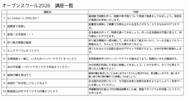 2026年5月16日(土)に開催の「オープンスクール2026」(5・6年生対象)の講座が決定しました!