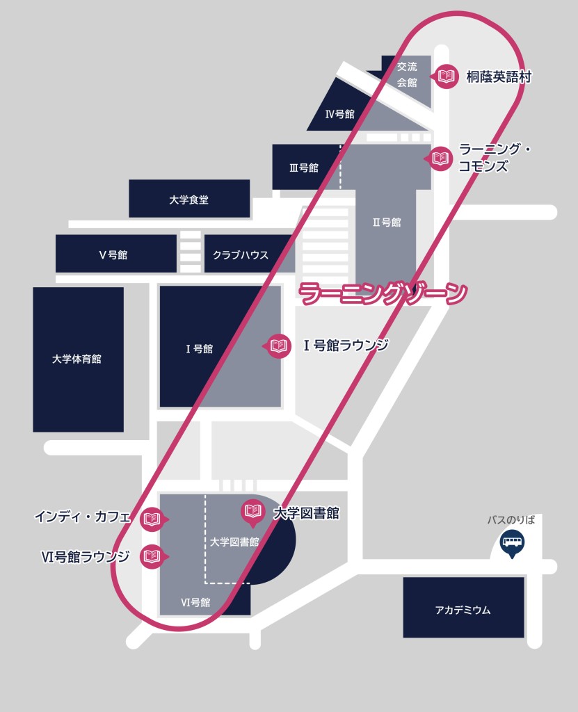 桐蔭横浜大学では、学生が自由に学べるスペースをラーニングスペースとして、キャンパス内の各所に配置しています。こうしたラーニングスペースが帯状に広がっており、この一帯をラーニングゾーンと呼んでいます。