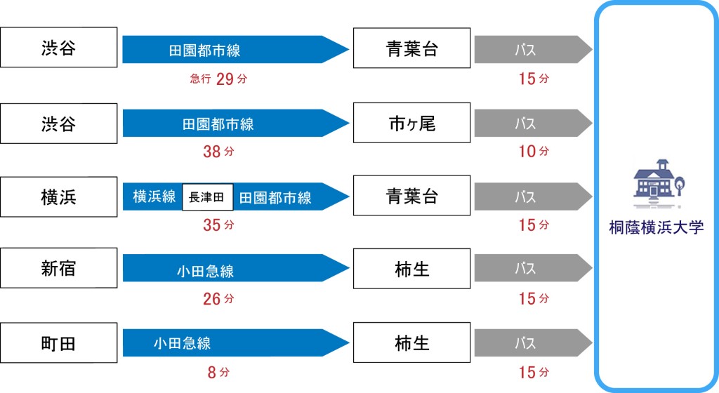 アクセスマップ Access map 所在地 桐蔭横浜大学 〒225-8503 神奈川県横浜市青葉区鉄町1614番地 Googleマップ キャンパスマップ 電車・バスをご利用の方 主要駅からの所要時間 青葉台からお越しの場合 市ヶ尾駅からお越しの場合 柿生駅からお越しの場合 学園周辺地図