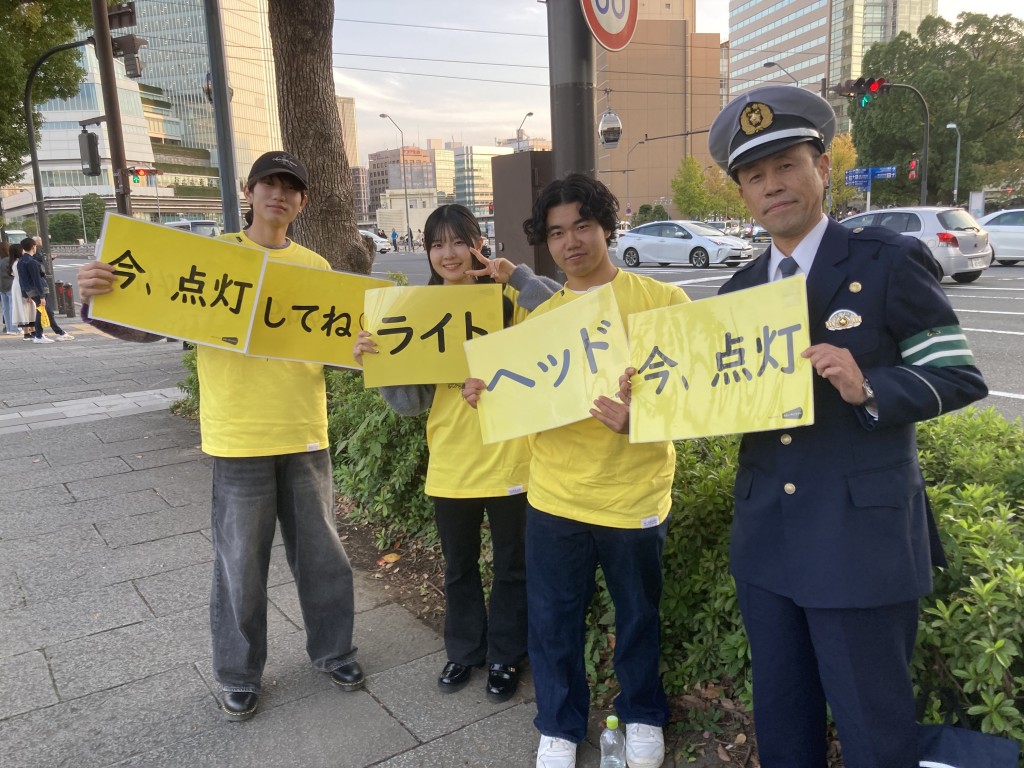 当日はおもいやりライト運動事務局や日産自動車、伊勢佐木警察署の協力のもと、点灯呼びかけアクションを交差点付近で実施し、赤信号で停車している車に対して、早めのヘッドライト点灯の呼びかけを行いました。