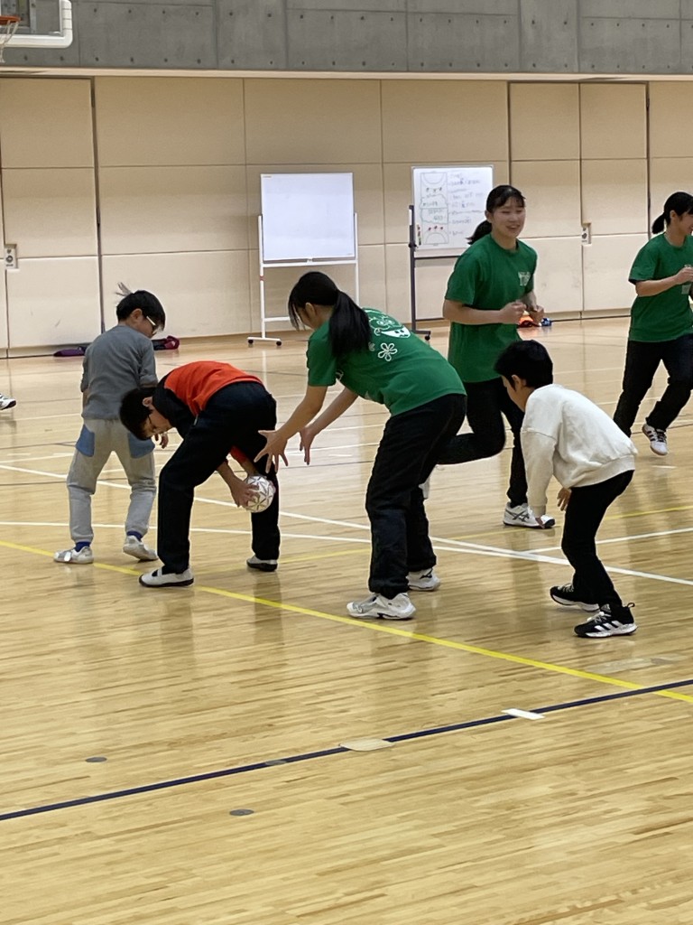 1月17日(土)、「桐蔭スポーツチャレンジ・セレクト2025 第7回ハンドボール教室」を開催し、経験者・未経験者あわせて14名の子どもたちが元気に集まってくれました。 今回は「スーパーシューターになろう!」をテーマに桐蔭横浜大学の女子ハンドボール部が講師を務めました。教室では、まずボールリレーでチーム対抗遊びを取り入れながら楽しく体を温めました。その後的確なパスの出し方や、力強いシュートのコツを大学生がレクチャー。最後はミニゲームと「親子シュート対決」も実施。終始笑顔の絶えない賑やかな教室となりました。